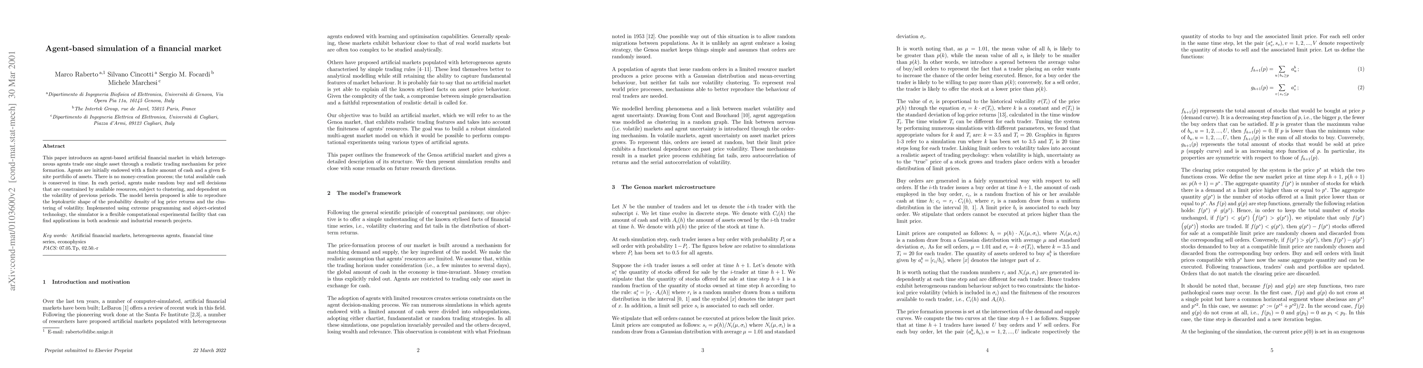 This paper introduces an agent-based artificial financial market in which heterogeneous agents trade one single asset through a realistic trading mechanism for price formation. Agents are initially endowed with a finite amount of cash and a given finite portfolio of assets. There is no money-creation process; the total available cash is conserved in time. In each period, agents make random buy and sell decisions that are constrained by available resources, subject to clustering, and dependent on the volatility of previous periods. The model herein proposed is able to reproduce the leptokurtic shape of the probability density of log price returns and the clustering of volatility. Implemented using extreme programming and object-oriented technology, the simulator is a flexible computational experimental facility that can find applications in both academic and industrial research projects.