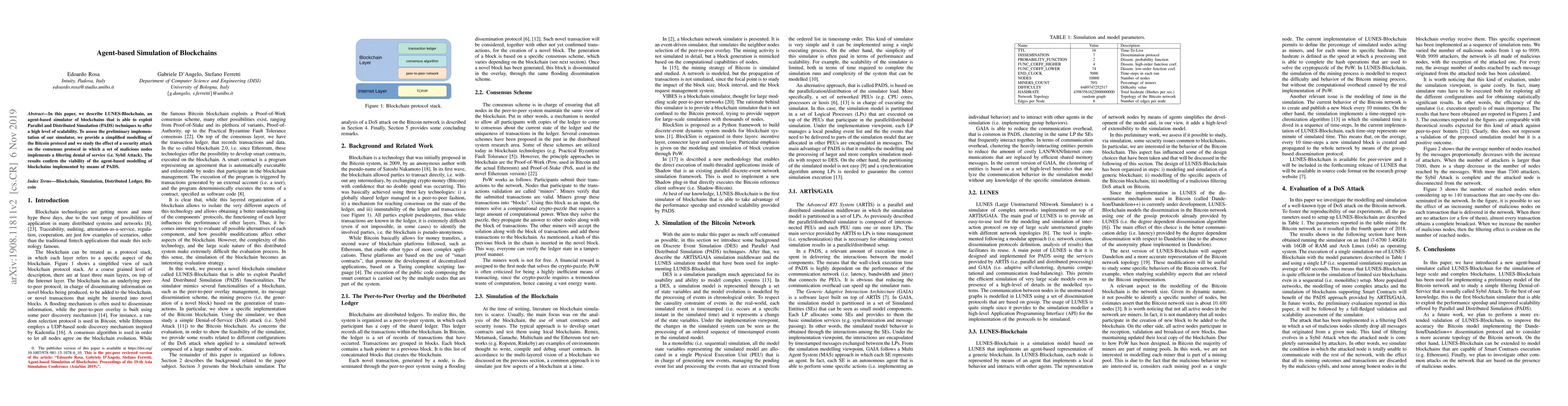 The main technical contribution is LUNES-Blockchain, an agent-based blockchain simulator built on ART`IS/GAIA that efficiently simulates large-scale unstructured networks using PADS, enabling the modeling and analysis of interaction protocols with high-level details.