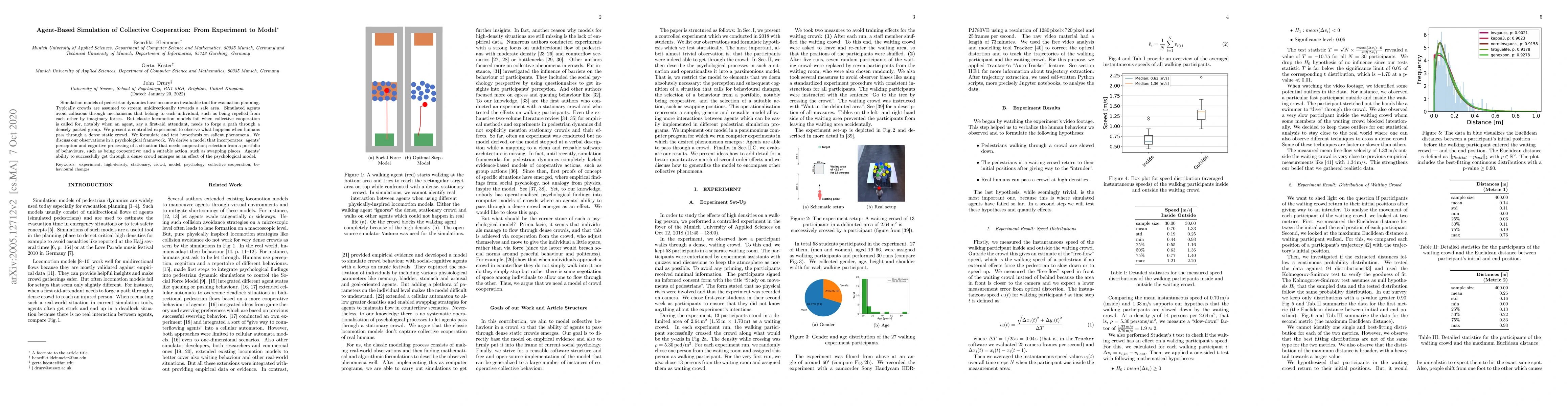 Simulation models of pedestrian dynamics have become an invaluable tool for evacuation planning. Typically crowds are assumed to stream unidirectionally towards a safe area. Simulated agents avoid collisions through mechanisms that belong to each individual, such as being repelled from each other by imaginary forces. But classic locomotion models fail when collective cooperation is called for, notably when an agent, say a first-aid attendant, needs to forge a path through a densely packed group. We present a controlled experiment to observe what happens when humans pass through a dense static crowd. We formulate and test hypothesis on salient phenomena. We discuss our observations in a psychological framework. We derive a model that incorporates: agents' perception and cognitive processing of a situation that needs cooperation; selection from a portfolio of behaviours, such as being cooperative; and a suitable action, such as swapping places. Agents' ability to successfully get through a dense crowd emerges as an effect of the psychological model.