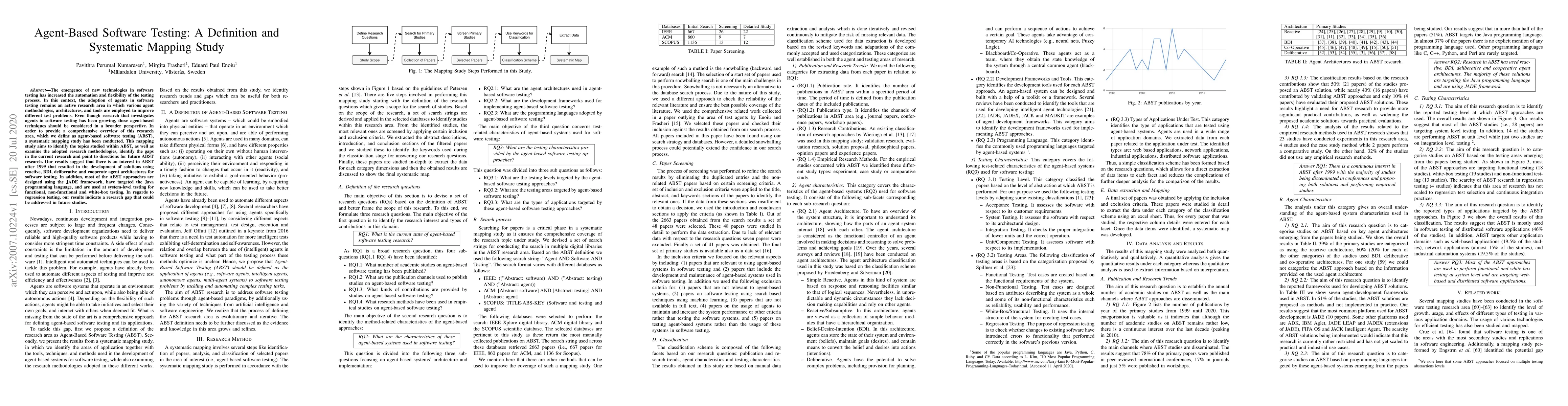 This paper conducts a systematic mapping study on agent-based software testing (ABST), identifying methodologies, architectures, and tools used, and highlighting a research gap in regression testing for future exploration. The study reveals a growing interest in ABST since 1999, with a focus on JADE framework, Java language, and system-level testing.