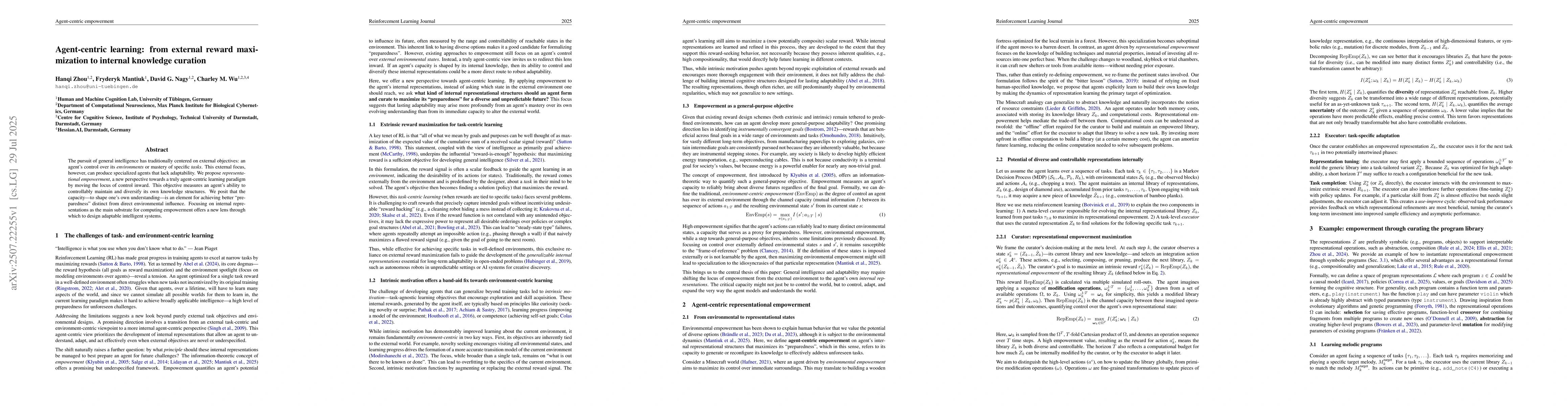 The pursuit of general intelligence has traditionally centered on external objectives: an agent's control over its environments or mastery of specific tasks. This external focus, however, can produce specialized agents that lack adaptability. We propose representational empowerment, a new perspective towards a truly agent-centric learning paradigm by moving the locus of control inward. This objective measures an agent's ability to controllably maintain and diversify its own knowledge structures. We posit that the capacity -- to shape one's own understanding -- is an element for achieving better ``preparedness'' distinct from direct environmental influence. Focusing on internal representations as the main substrate for computing empowerment offers a new lens through which to design adaptable intelligent systems.