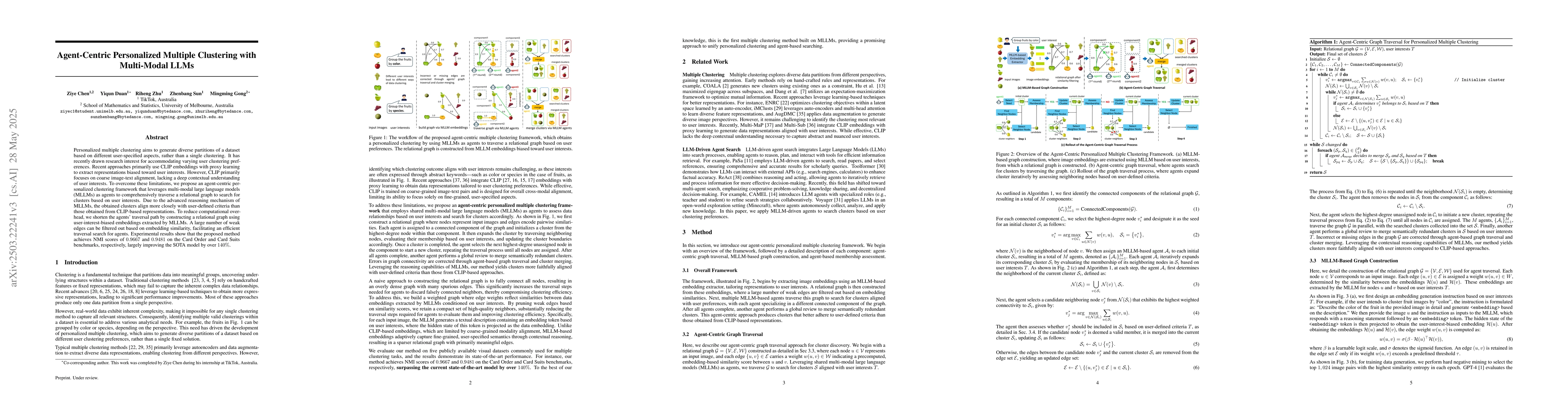 The technical contribution lies in the development of an agent-centric personalized clustering framework that utilizes multi-modal large language models for efficient and accurate clustering based on user-specific aspects.