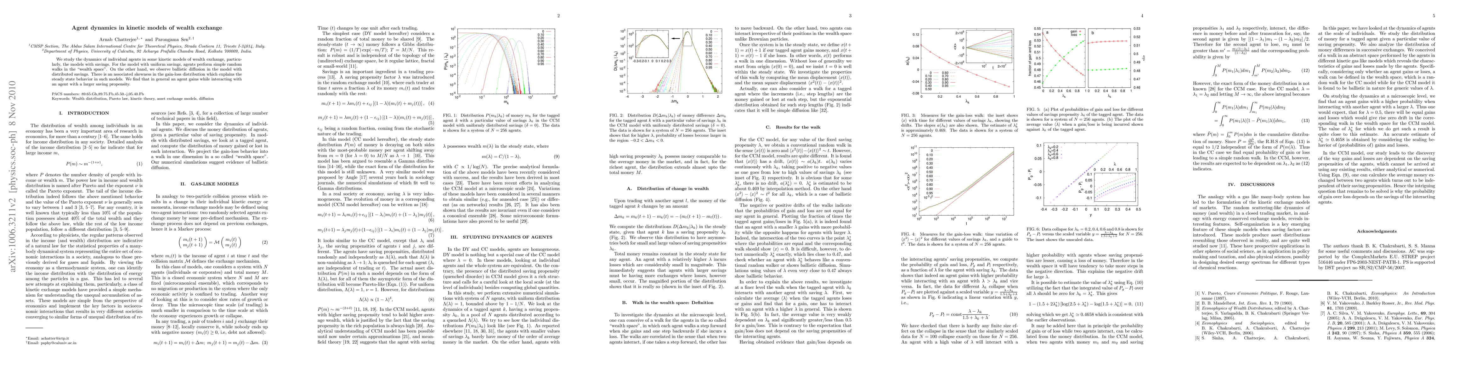 This paper investigates the dynamics of agents in kinetic models of wealth exchange, revealing simple random walks in models with uniform savings and ballistic diffusion in those with distributed savings. The study highlights a skewness in the gain-loss distribution that explains steady state behavior, showing that agents tend to gain more when interacting with those having higher saving propensities.