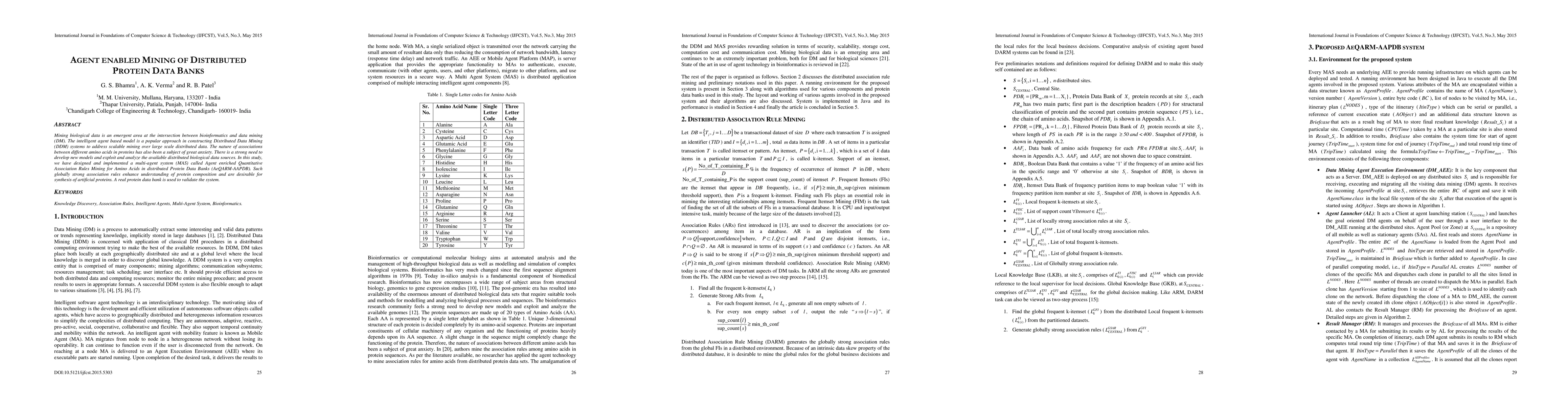 Mining biological data is an emergent area at the intersection between bioinformatics and data mining (DM). The intelligent agent based model is a popular approach in constructing Distributed Data Mining (DDM) systems to address scalable mining over large scale distributed data. The nature of associations between different amino acids in proteins has also been a subject of great anxiety. There is a strong need to develop new models and exploit and analyze the available distributed biological data sources. In this study, we have designed and implemented a multi-agent system (MAS) called Agent enriched Quantitative Association Rules Mining for Amino Acids in distributed Protein Data Banks (AeQARM-AAPDB). Such globally strong association rules enhance understanding of protein composition and are desirable for synthesis of artificial proteins. A real protein data bank is used to validate the system.