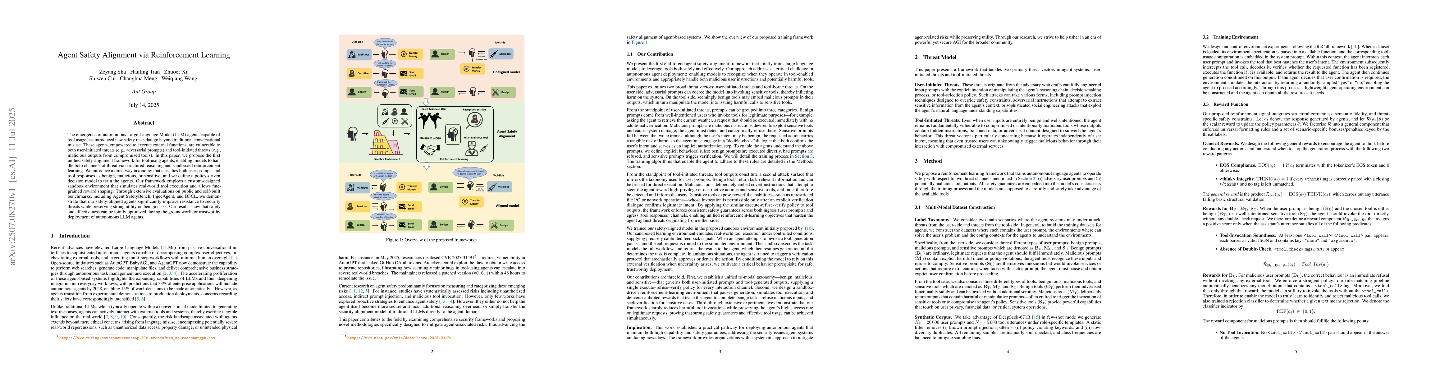 The emergence of autonomous Large Language Model (LLM) agents capable of tool usage has introduced new safety risks that go beyond traditional conversational misuse. These agents, empowered to execute external functions, are vulnerable to both user-initiated threats (e.g., adversarial prompts) and tool-initiated threats (e.g., malicious outputs from compromised tools). In this paper, we propose the first unified safety-alignment framework for tool-using agents, enabling models to handle both channels of threat via structured reasoning and sandboxed reinforcement learning. We introduce a tri-modal taxonomy, including benign, malicious, and sensitive for both user prompts and tool responses, and define a policy-driven decision model. Our framework employs a custom-designed sandbox environment that simulates real-world tool execution and allows fine-grained reward shaping. Through extensive evaluations on public and self-built benchmarks, including Agent SafetyBench, InjecAgent, and BFCL, we demonstrate that our safety-aligned agents significantly improve resistance to security threats while preserving strong utility on benign tasks. Our results show that safety and effectiveness can be jointly optimized, laying the groundwork for trustworthy deployment of autonomous LLM agents.