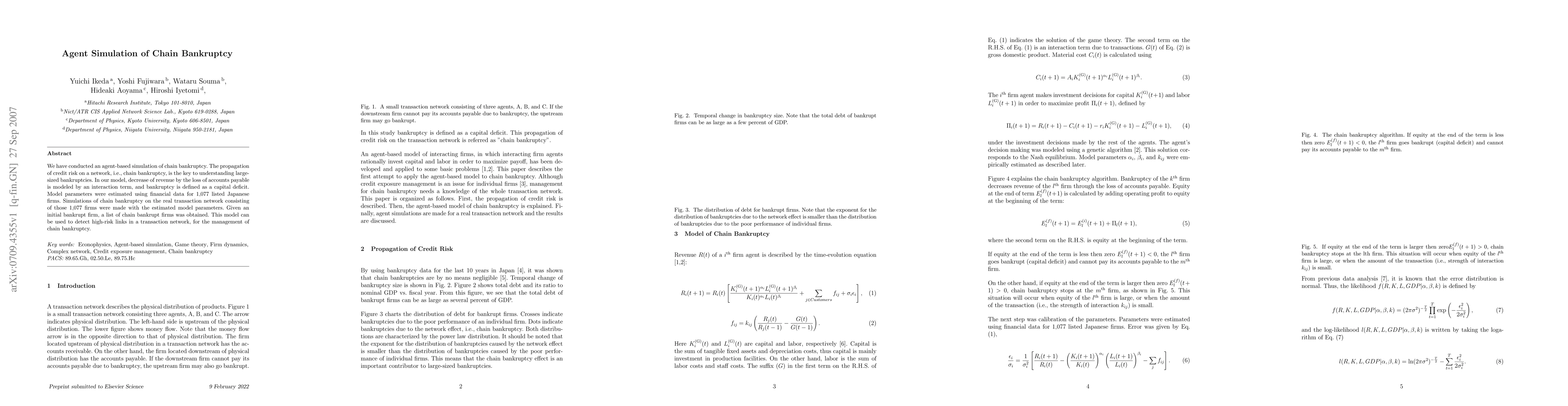 The research employs an agent-based simulation to model chain bankruptcy, where the propagation of credit risk on a network is analyzed using financial data from 1,077 listed Japanese firms. The model incorporates a game theory solution with an interaction term for transactions, and bankruptcy is defined by a capital deficit.