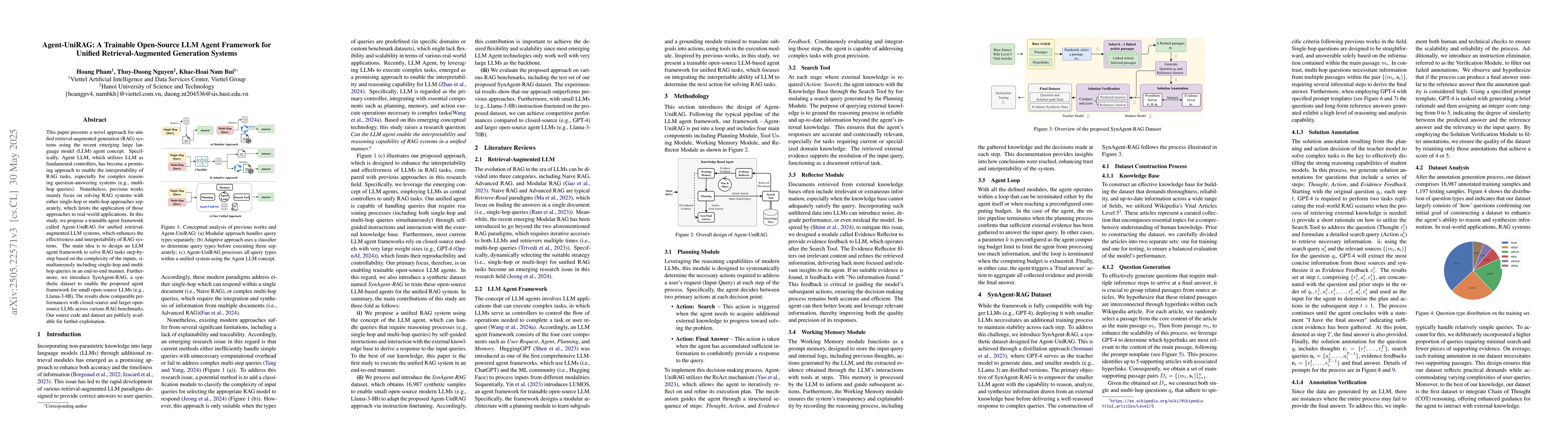 The paper proposes Agent-UniRAG, a trainable open-source LLM agent framework designed for unified retrieval-augmented generation systems. It combines single-hop and multi-hop queries in an end-to-end manner, utilizing an LLM agent to enhance the effectiveness and interpretability of RAG tasks.
