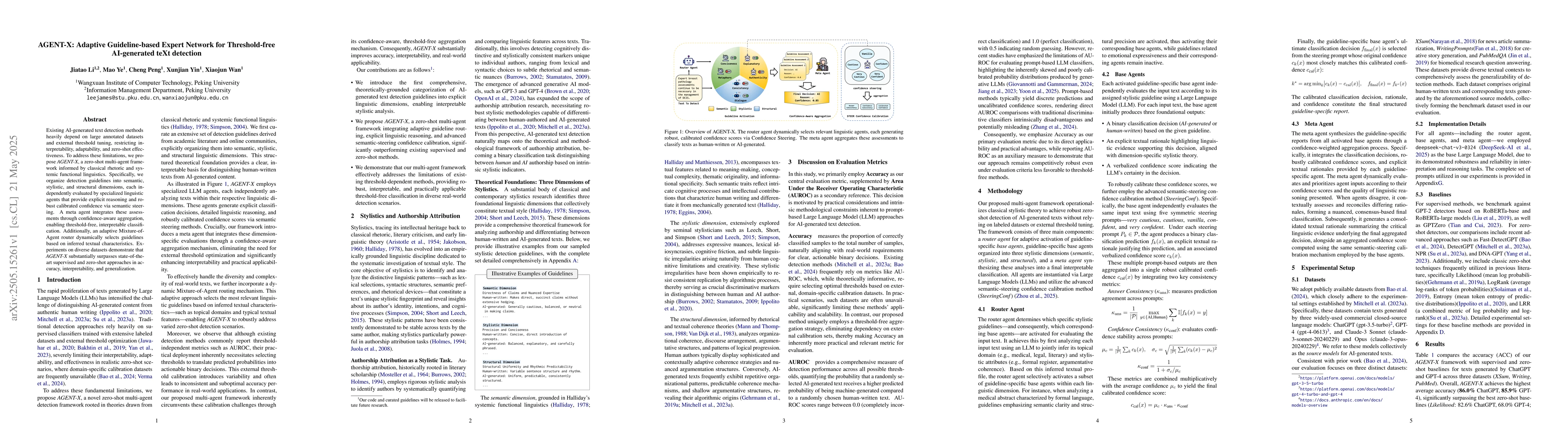 The development of AGENT-X, a novel adaptive guideline-based expert network for threshold-free AI-generated text detection.
