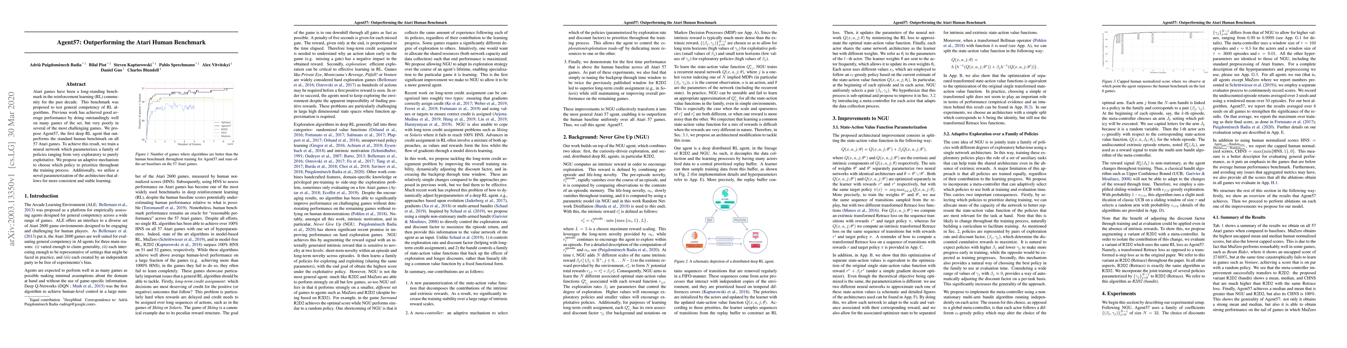 Agent57 is the first deep reinforcement learning agent to surpass the human benchmark on all 57 Atari games, utilizing a neural network that adaptively selects between exploratory and exploitative policies, and a novel architecture parameterization for stable learning.
