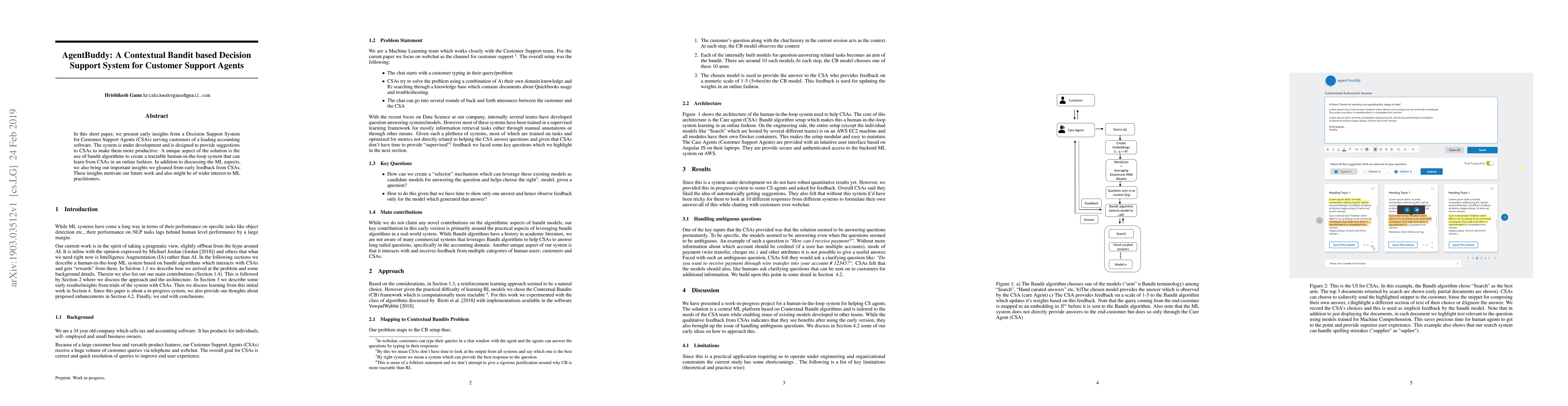 AgentBuddy employs contextual bandit algorithms to develop a decision support system for customer support agents, aiming to enhance productivity through online learning. Early feedback from agents provides valuable insights that inform future improvements and may benefit broader machine learning applications.