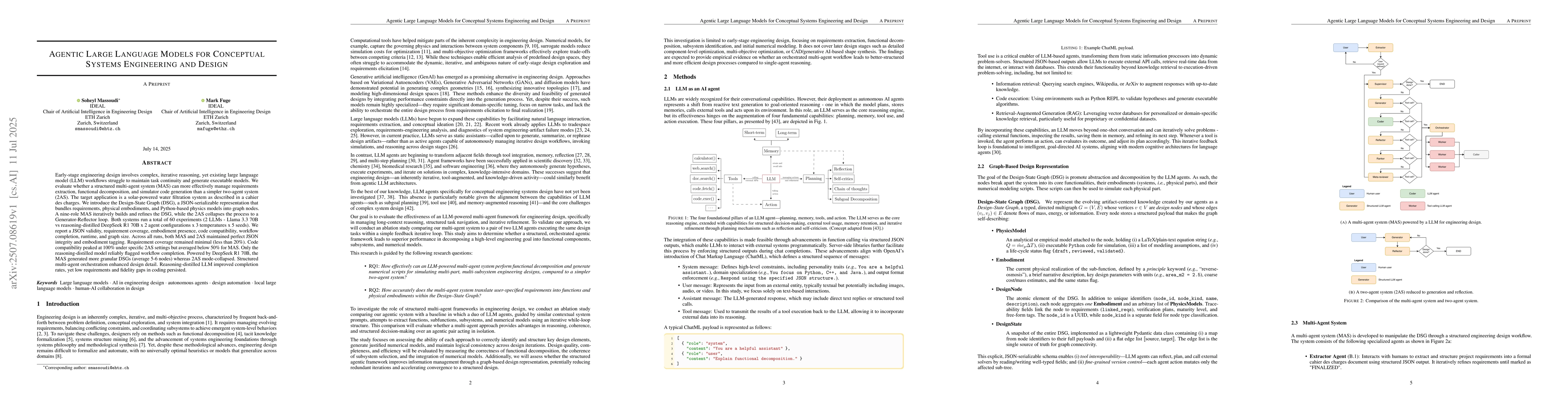 Early-stage engineering design involves complex, iterative reasoning, yet existing large language model (LLM) workflows struggle to maintain task continuity and generate executable models. We evaluate whether a structured multi-agent system (MAS) can more effectively manage requirements extraction, functional decomposition, and simulator code generation than a simpler two-agent system (2AS). The target application is a solar-powered water filtration system as described in a cahier des charges. We introduce the Design-State Graph (DSG), a JSON-serializable representation that bundles requirements, physical embodiments, and Python-based physics models into graph nodes. A nine-role MAS iteratively builds and refines the DSG, while the 2AS collapses the process to a Generator-Reflector loop. Both systems run a total of 60 experiments (2 LLMs - Llama 3.3 70B vs reasoning-distilled DeepSeek R1 70B x 2 agent configurations x 3 temperatures x 5 seeds). We report a JSON validity, requirement coverage, embodiment presence, code compatibility, workflow completion, runtime, and graph size. Across all runs, both MAS and 2AS maintained perfect JSON integrity and embodiment tagging. Requirement coverage remained minimal (less than 20\%). Code compatibility peaked at 100\% under specific 2AS settings but averaged below 50\% for MAS. Only the reasoning-distilled model reliably flagged workflow completion. Powered by DeepSeek R1 70B, the MAS generated more granular DSGs (average 5-6 nodes) whereas 2AS mode-collapsed. Structured multi-agent orchestration enhanced design detail. Reasoning-distilled LLM improved completion rates, yet low requirements and fidelity gaps in coding persisted.
