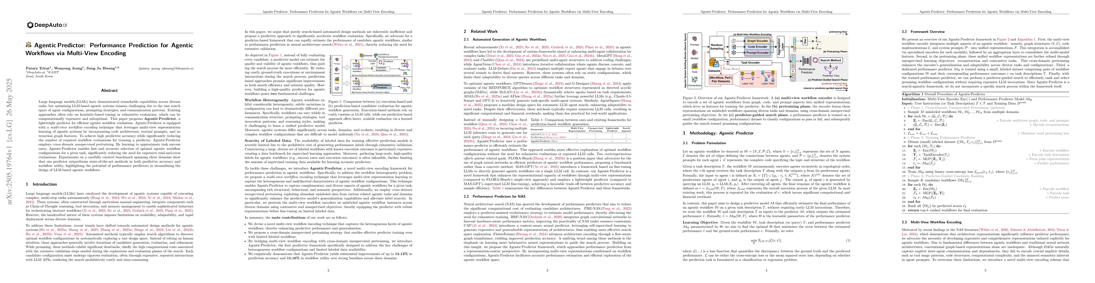 The research proposes Agentic Predictor, a lightweight predictor for efficient agentic workflow evaluation. It uses multi-view workflow encoding, incorporating code architecture, textual prompts, and interaction graph features. Cross-domain unsupervised pretraining is employed to achieve high predictive accuracy with fewer workflow evaluations.
