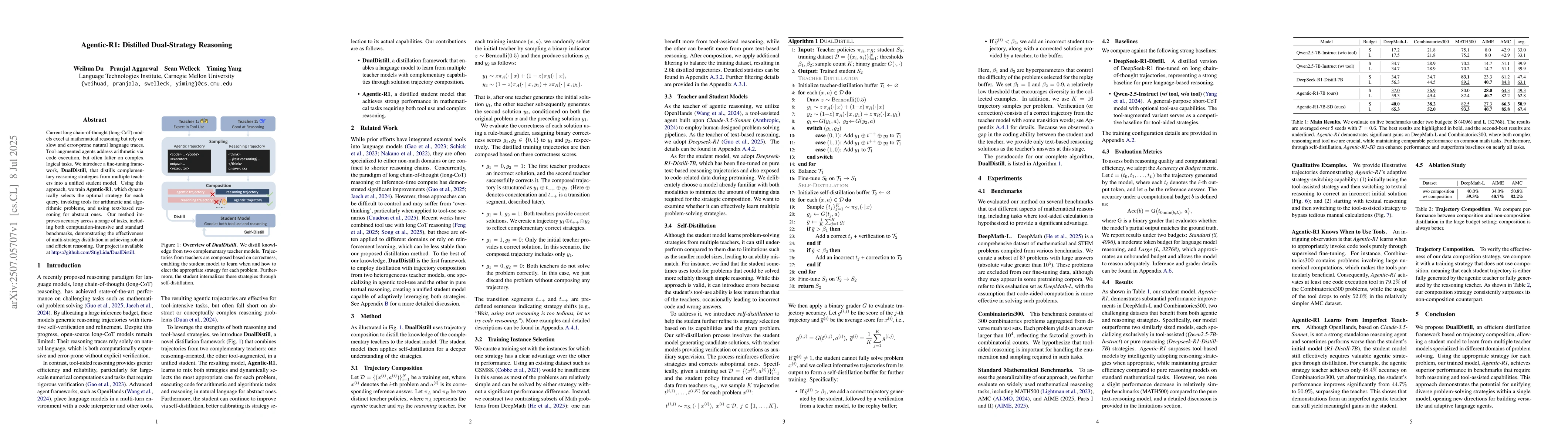 Introduces a fine-tuning framework, DualDistill, that distills complementary reasoning strategies from multiple teachers into a unified student model, Agentic-R1, which dynamically selects the optimal strategy for each query.