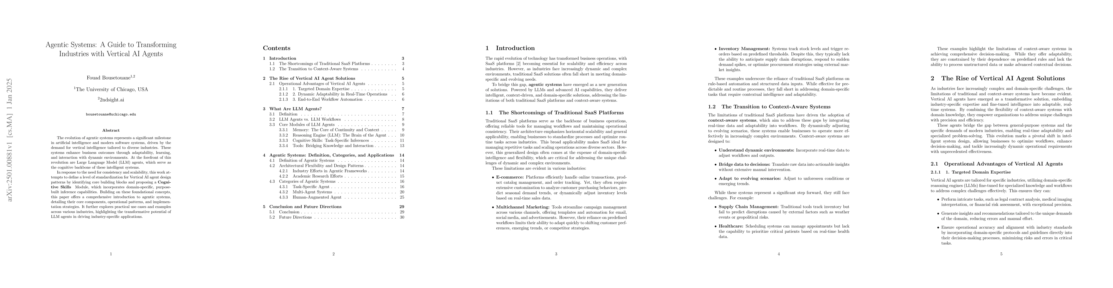 The evolution of agentic systems represents a significant milestone in artificial intelligence and modern software systems, driven by the demand for vertical intelligence tailored to diverse industries. These systems enhance business outcomes through adaptability, learning, and interaction with dynamic environments. At the forefront of this revolution are Large Language Model (LLM) agents, which serve as the cognitive backbone of these intelligent systems. In response to the need for consistency and scalability, this work attempts to define a level of standardization for Vertical AI agent design patterns by identifying core building blocks and proposing a \textbf{Cognitive Skills } Module, which incorporates domain-specific, purpose-built inference capabilities. Building on these foundational concepts, this paper offers a comprehensive introduction to agentic systems, detailing their core components, operational patterns, and implementation strategies. It further explores practical use cases and examples across various industries, highlighting the transformative potential of LLM agents in driving industry-specific applications.