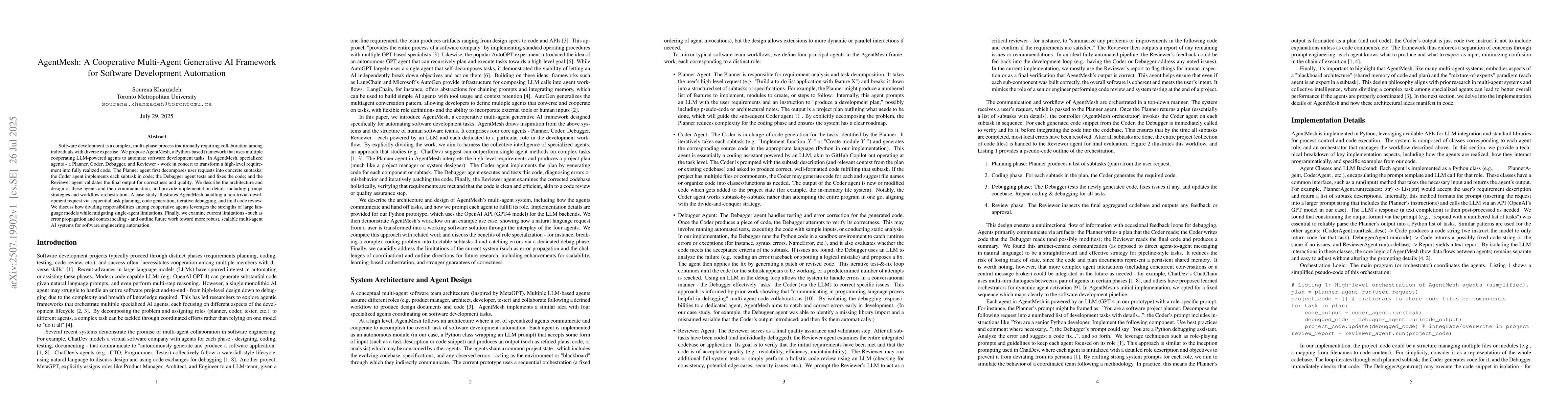 Software development is a complex, multi-phase process traditionally requiring collaboration among individuals with diverse expertise. We propose AgentMesh, a Python-based framework that uses multiple cooperating LLM-powered agents to automate software development tasks. In AgentMesh, specialized agents - a Planner, Coder, Debugger, and Reviewer - work in concert to transform a high-level requirement into fully realized code. The Planner agent first decomposes user requests into concrete subtasks; the Coder agent implements each subtask in code; the Debugger agent tests and fixes the code; and the Reviewer agent validates the final output for correctness and quality. We describe the architecture and design of these agents and their communication, and provide implementation details including prompt strategies and workflow orchestration. A case study illustrates AgentMesh handling a non-trivial development request via sequential task planning, code generation, iterative debugging, and final code review. We discuss how dividing responsibilities among cooperative agents leverages the strengths of large language models while mitigating single-agent limitations. Finally, we examine current limitations - such as error propagation and context scaling - and outline future work toward more robust, scalable multi-agent AI systems for software engineering automation.