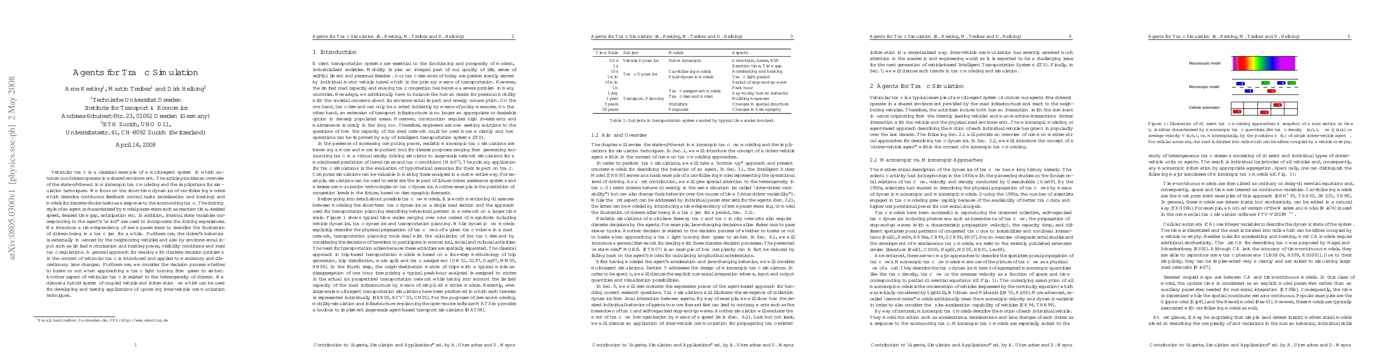 Vehicular traffic is a classical example of a multi-agent system in which autonomous drivers operate in a shared environment. The article provides an overview of the state-of-the-art in microscopic traffic modeling and the implications for simulation techniques. We focus on the short-time dynamics of car-following models which describe continuous feedback control tasks (acceleration and braking) and models for discrete-choice tasks as a response to the surrounding traffic. The driving style of an agent is characterized by model parameters such as reaction time, desired speed, desired time gap, anticipation etc. In addition, internal state variables corresponding to the agent's "mind" are used to incorporate the driving experiences. We introduce a time-dependency of some parameters to describe the frustration of drivers being in a traffic jam for a while. Furthermore, the driver's behavior is externally influenced by the neighboring vehicles and also by environmental input such as limited motorization and braking power, visibility conditions and road traffic regulations. A general approach for dealing with discrete decision problems in the context of vehicular traffic is introduced and applied to mandatory and discretionary lane changes. Furthermore, we consider the decision process whether to brake or not when approaching a traffic light turning from green to amber. Another aspect of vehicular traffic is related to the heterogeneity of drivers. We discuss a hybrid system of coupled vehicle and information flow which can be used for developing and testing applications of upcoming inter-vehicle communication techniques.