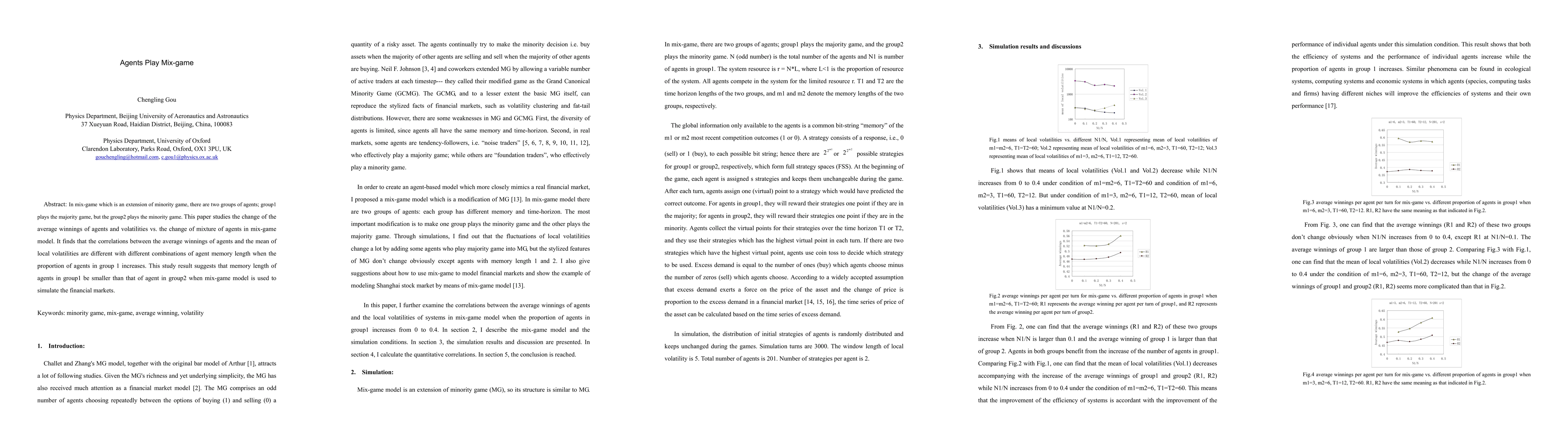 The paper studies the mix-game model, an extension of the minority game, focusing on the behavior of two groups of agents with distinct roles in majority and minority games. It examines the relationship between average agent winnings, volatilities, and the mixture of agents with varying memory lengths.
