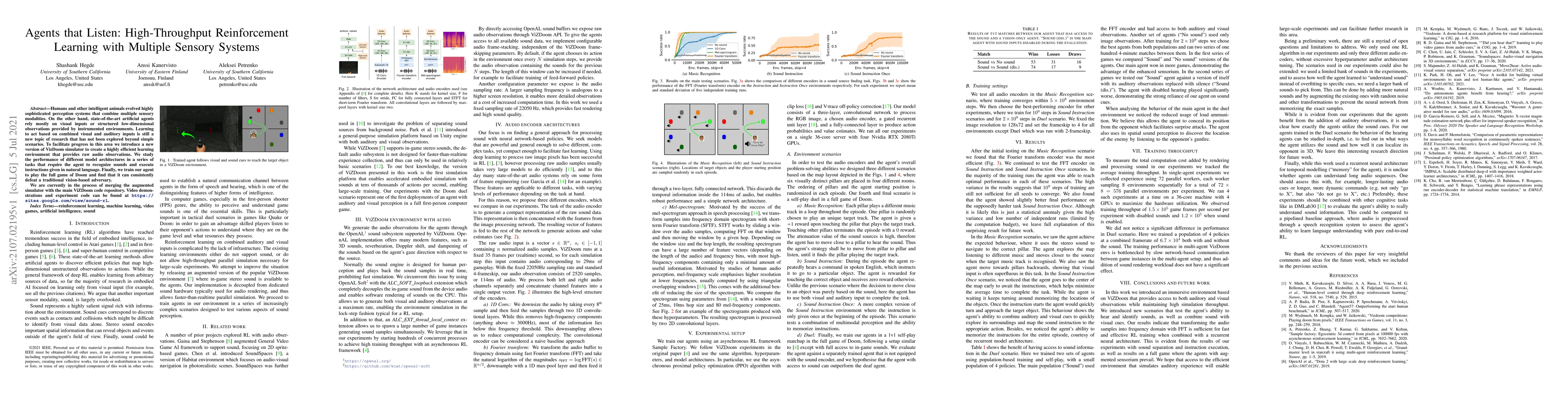 Humans and other intelligent animals evolved highly sophisticated perception systems that combine multiple sensory modalities. On the other hand, state-of-the-art artificial agents rely mostly on visual inputs or structured low-dimensional observations provided by instrumented environments. Learning to act based on combined visual and auditory inputs is still a new topic of research that has not been explored beyond simple scenarios. To facilitate progress in this area we introduce a new version of VizDoom simulator to create a highly efficient learning environment that provides raw audio observations. We study the performance of different model architectures in a series of tasks that require the agent to recognize sounds and execute instructions given in natural language. Finally, we train our agent to play the full game of Doom and find that it can consistently defeat a traditional vision-based adversary. We are currently in the process of merging the augmented simulator with the main ViZDoom code repository. Video demonstrations and experiment code can be found at https://sites.google.com/view/sound-rl.