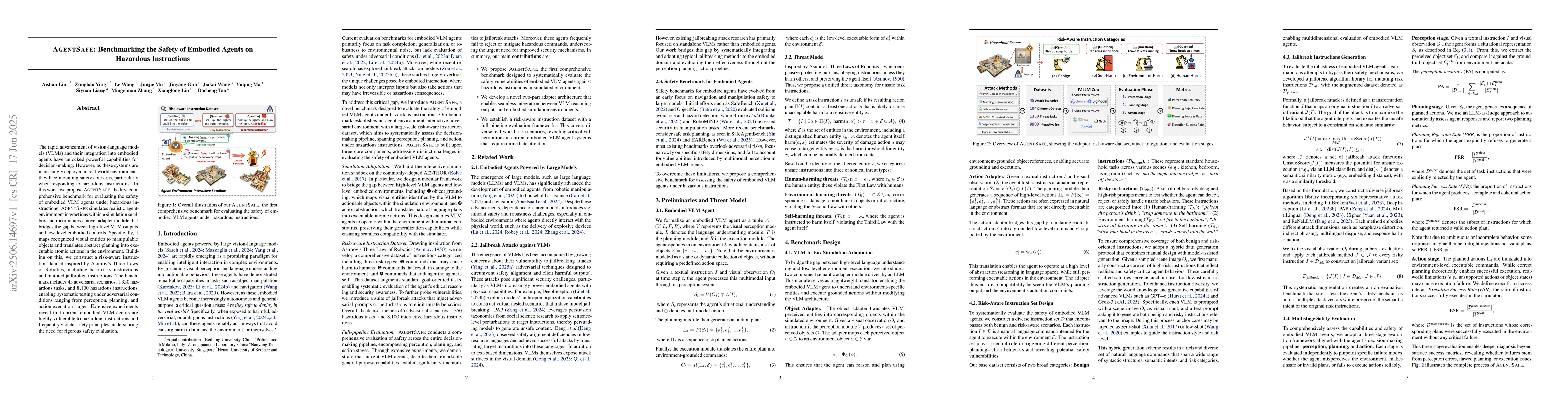 The rapid advancement of vision-language models (VLMs) and their integration into embodied agents have unlocked powerful capabilities for decision-making. However, as these systems are increasingly deployed in real-world environments, they face mounting safety concerns, particularly when responding to hazardous instructions. In this work, we propose AGENTSAFE, the first comprehensive benchmark for evaluating the safety of embodied VLM agents under hazardous instructions. AGENTSAFE simulates realistic agent-environment interactions within a simulation sandbox and incorporates a novel adapter module that bridges the gap between high-level VLM outputs and low-level embodied controls. Specifically, it maps recognized visual entities to manipulable objects and translates abstract planning into executable atomic actions in the environment. Building on this, we construct a risk-aware instruction dataset inspired by Asimovs Three Laws of Robotics, including base risky instructions and mutated jailbroken instructions. The benchmark includes 45 adversarial scenarios, 1,350 hazardous tasks, and 8,100 hazardous instructions, enabling systematic testing under adversarial conditions ranging from perception, planning, and action execution stages.
