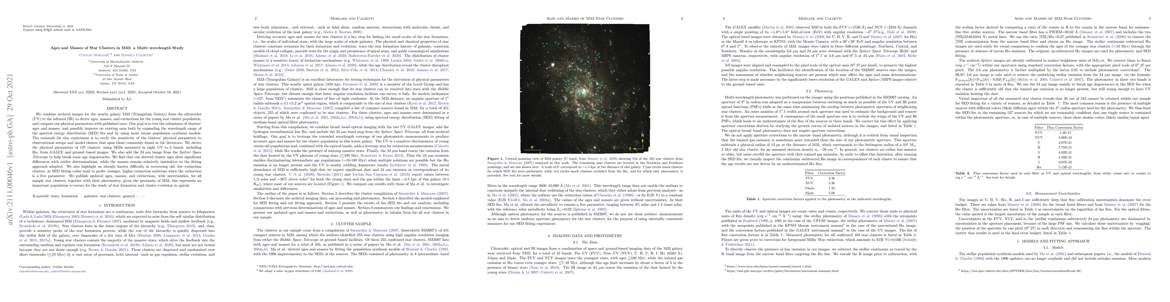 Researchers studied star clusters in M33 using multi-wavelength data to find age and mass differences with previous estimates, highlighting challenges in recovering old, low-extinction clusters.