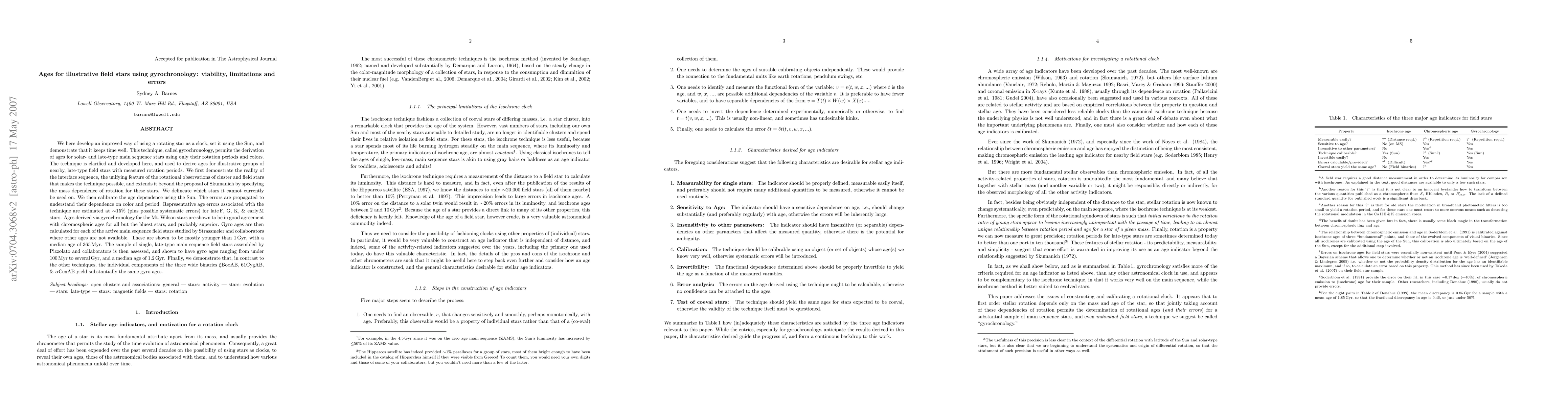This paper develops gyrochronology, a method to estimate ages of solar- and late-type main sequence stars based on their rotation periods and colors, calibrated using the Sun. It finds ages for illustrative field stars, showing good agreement with chromospheric ages and median ages of 365Myr and 1.2Gyr for different samples, while noting limitations and ~15% age error.