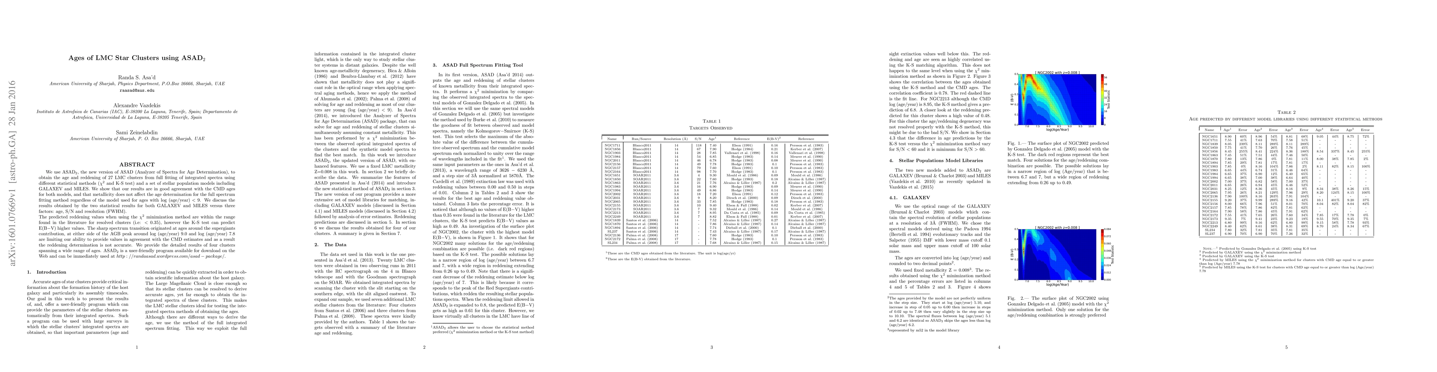 We use ASAD$_2$, the new version of ASAD (Analyzer of Spectra for Age Determination), to obtain the age and reddening of 27 LMC clusters from full fitting of integrated spectra using different statistical methods ($\chi^{2}$ and K-S test) and a set of stellar population models including GALAXEV and MILES. We show that our results are in good agreement with the CMD ages for both models, and that metallicity does not affect the age determination for the full spectrum fitting method regardless of the model used for ages with log (age/year) $<$ 9. We discuss the results obtained by the two statistical results for both GALAXEV and MILES versus three factors: age, S/N and resolution (FWHM). The predicted reddening values when using the $\chi^{2}$ minimization method are within the range found in the literature for resolved clusters (i.e: $<$ 0.35), however the K-S test can predict E(B$-$V) higher values. The sharp spectrum transition originated at ages around the supergiants contribution, at either side of the AGB peak around log (age/year) 9.0 and log (age/year) 7.8 are limiting our ability to provide values in agreement with the CMD estimates and as a result the reddening determination is not accurate. We provide the detailed results of four clusters spanning a wide range of ages. ASAD$_2$ is a user-friendly program available for download on the Web and can be immediately used at $http://randaasad.wordpress.com/asad-package/$.