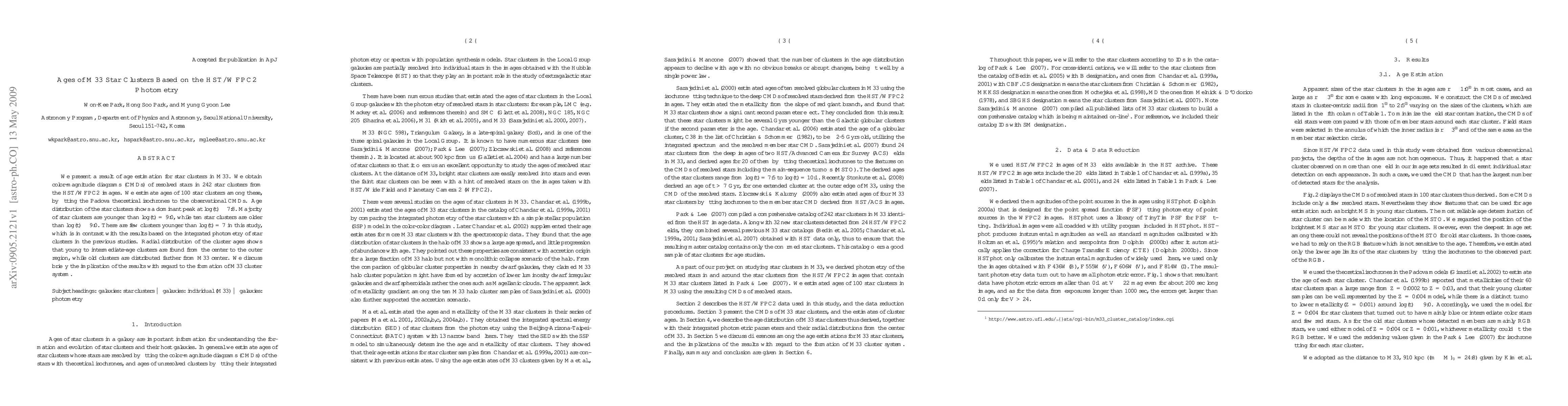 This study estimates the ages of 100 star clusters in M33 using HST/WFPC2 photometry, revealing a dominant age peak at log(t) ~ 7.8, with most clusters younger than log(t) = 9.0 and a radial distribution indicating younger clusters closer to the center.