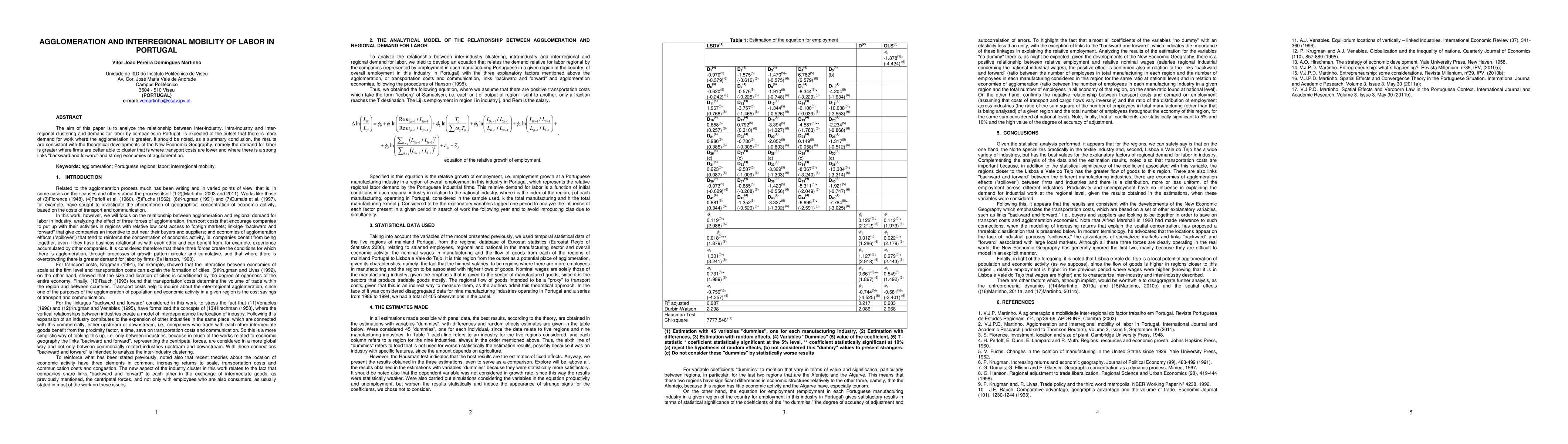 The aim of this paper is to analyze the relationship between inter-industry, intra-industry and inter-regional clustering and demand for labor by companies in Portugal. Is expected at the outset that there is more demand for work where the agglomeration is greater. It should be noted, as a summary conclusion, the results are consistent with the theoretical developments of the New Economic Geography, namely the demand for labor is greater where firms are better able to cluster that is where transport costs are lower and where there is a strong links "backward and forward" and strong economies of agglomeration.