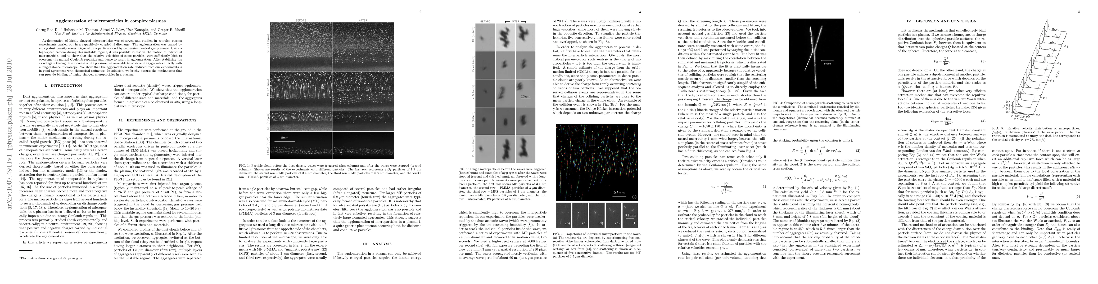 This study investigates the agglomeration of highly charged microparticles in complex plasmas, revealing that decreasing neutral gas pressure induces strong dust density waves, leading to particle collisions and agglomeration despite Coulomb repulsion. The results align with theoretical predictions, and the mechanisms for binding these particles in plasma are briefly discussed.