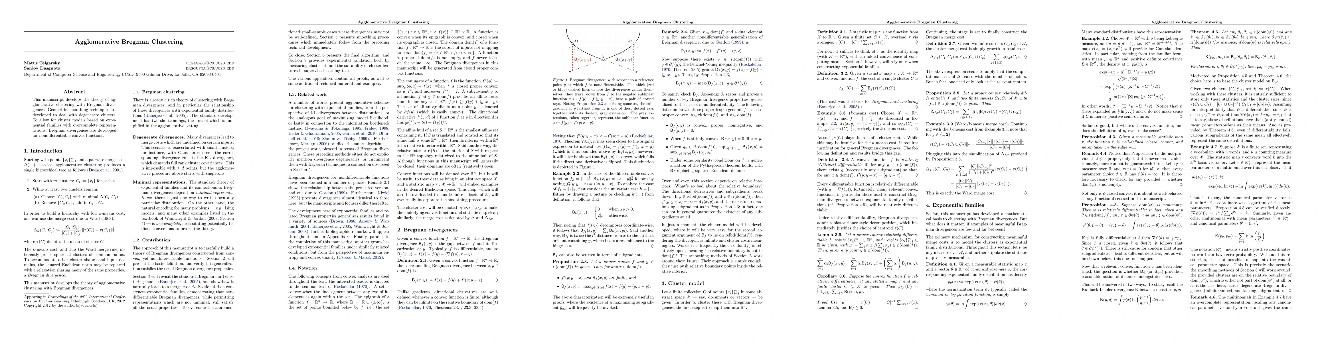 This manuscript develops the theory of agglomerative clustering with Bregman divergences. Geometric smoothing techniques are developed to deal with degenerate clusters. To allow for cluster models based on exponential families with overcomplete representations, Bregman divergences are developed for nondifferentiable convex functions.