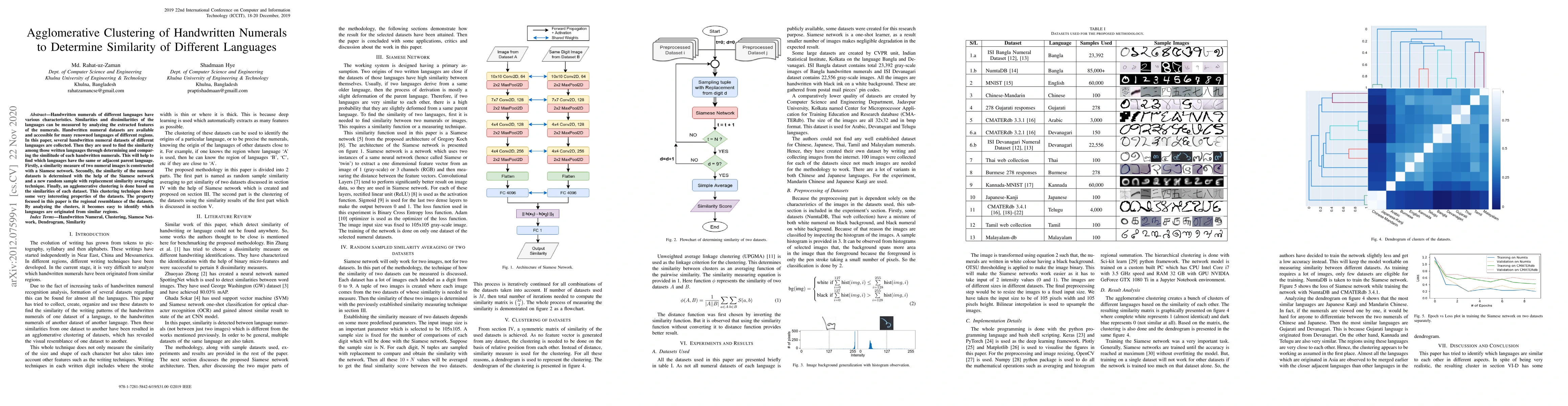 This paper uses agglomerative clustering and a Siamese network to analyze similarities among handwritten numeral datasets from different languages, revealing regional resemblances and potential parent language relationships. The study employs a novel similarity averaging technique to compare numeral images and cluster datasets based on their features.