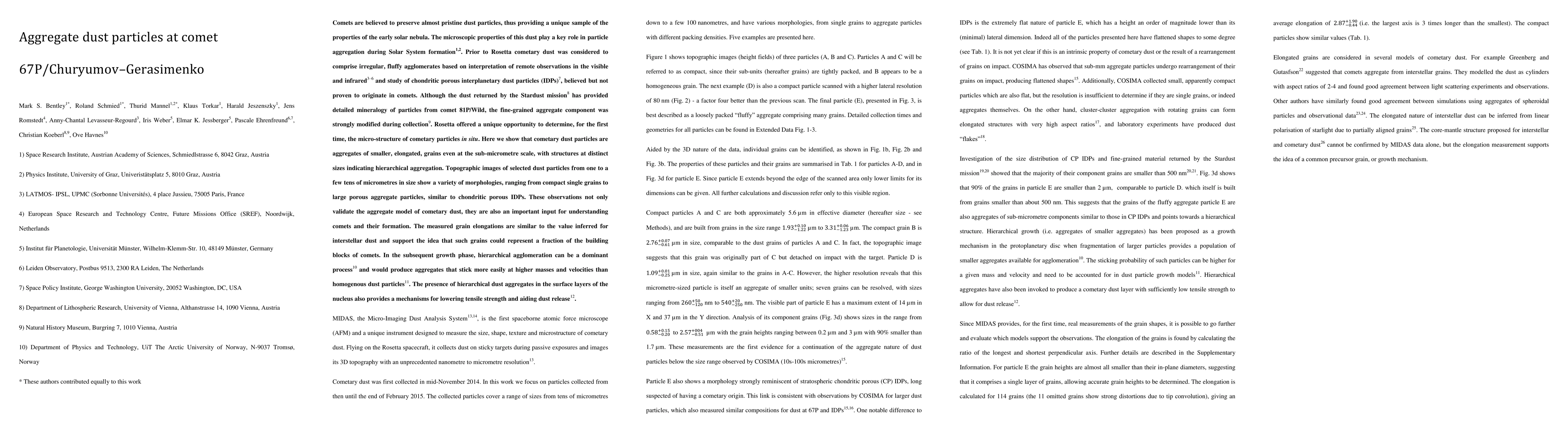 This study reports in situ measurements of dust particles at comet 67P/Churyumov-Gerasimenko, revealing aggregates of elongated grains with hierarchical structures. These findings suggest a dominant process of hierarchical agglomeration during the formation of the Solar System and provide a mechanism for dust release from the comet's nucleus.