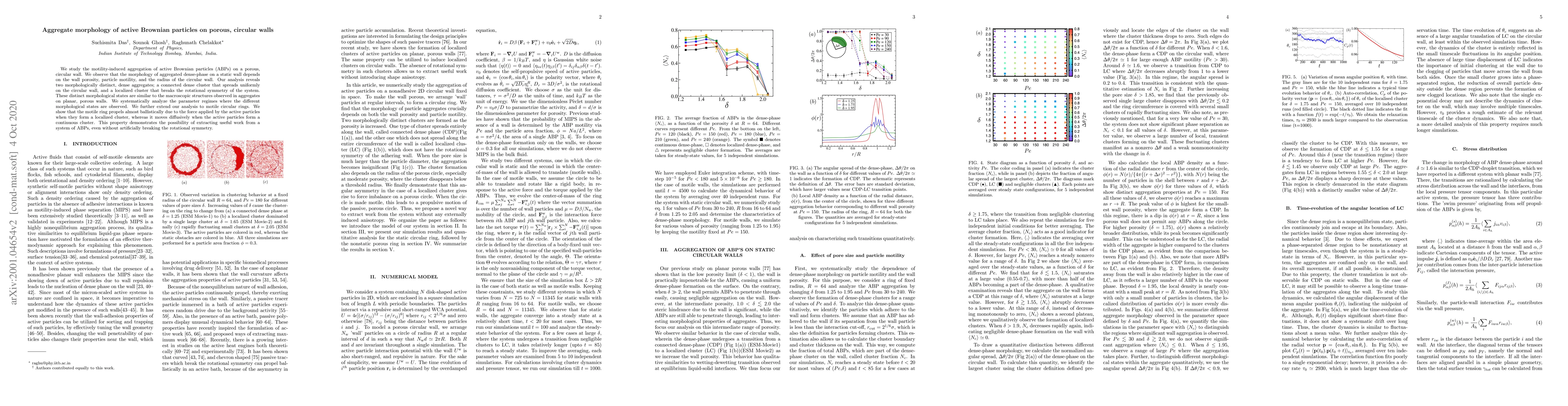 This study investigates the aggregation patterns of active Brownian particles on porous, circular walls, revealing two distinct dense aggregate morphologies: a uniformly spreading cluster and a localized, symmetry-breaking cluster. The analysis identifies parameter regimes for these states and shows that motile rings can propel ballistically or diffusely based on particle clustering.