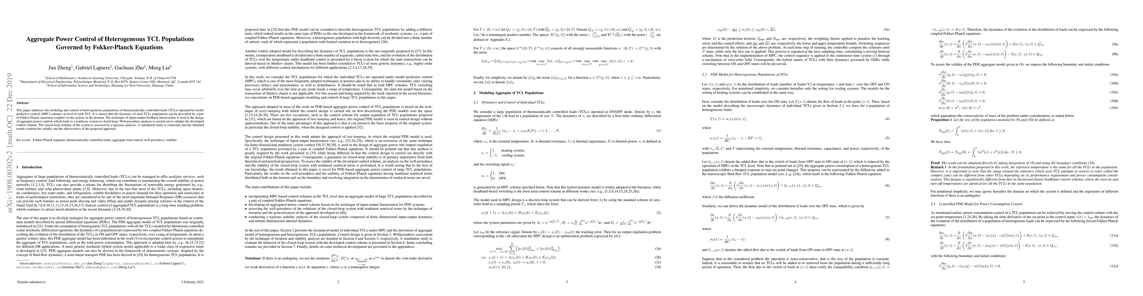 This paper presents a control method for optimizing power consumption in heterogeneous TCL populations using Fokker-Planck equations and input-output feedback linearization. It validates the approach through well-posedness analysis, stability assessment, and simulation results.
