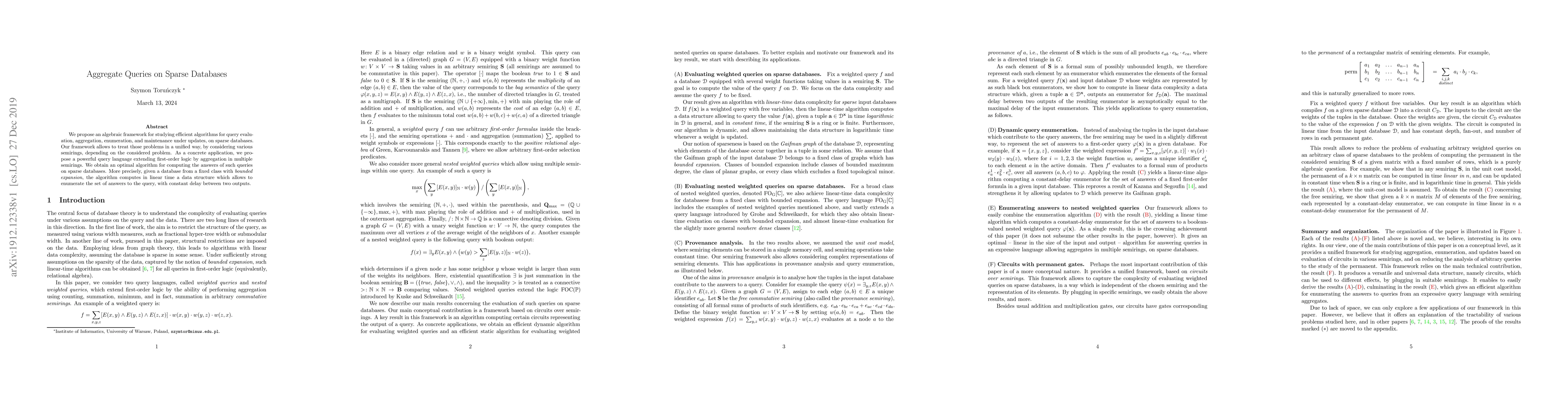 We propose an algebraic framework for studying efficient algorithms for query evaluation, aggregation, enumeration, and maintenance under updates, on sparse databases. Our framework allows to treat those problems in a unified way, by considering various semirings, depending on the considered problem. As a concrete application, we propose a powerful query language extending first-order logic by aggregation in multiple semirings. We obtain an optimal algorithm for computing the answers of such queries on sparse databases. More precisely, given a database from a fixed class with bounded expansion, the algorithm computes in linear time a data structure which allows to enumerate the set of answers to the query, with constant delay between two outputs.