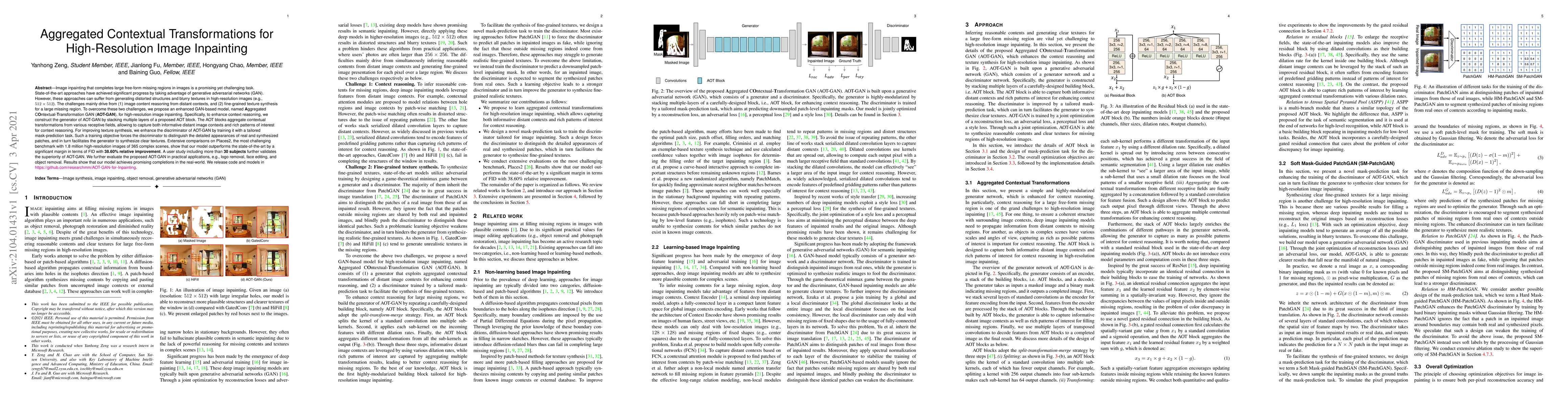 State-of-the-art image inpainting approaches can suffer from generating distorted structures and blurry textures in high-resolution images (e.g., 512x512). The challenges mainly drive from (1) image content reasoning from distant contexts, and (2) fine-grained texture synthesis for a large missing region. To overcome these two challenges, we propose an enhanced GAN-based model, named Aggregated COntextual-Transformation GAN (AOT-GAN), for high-resolution image inpainting. Specifically, to enhance context reasoning, we construct the generator of AOT-GAN by stacking multiple layers of a proposed AOT block. The AOT blocks aggregate contextual transformations from various receptive fields, allowing to capture both informative distant image contexts and rich patterns of interest for context reasoning. For improving texture synthesis, we enhance the discriminator of AOT-GAN by training it with a tailored mask-prediction task. Such a training objective forces the discriminator to distinguish the detailed appearances of real and synthesized patches, and in turn, facilitates the generator to synthesize clear textures. Extensive comparisons on Places2, the most challenging benchmark with 1.8 million high-resolution images of 365 complex scenes, show that our model outperforms the state-of-the-art by a significant margin in terms of FID with 38.60% relative improvement. A user study including more than 30 subjects further validates the superiority of AOT-GAN. We further evaluate the proposed AOT-GAN in practical applications, e.g., logo removal, face editing, and object removal. Results show that our model achieves promising completions in the real world. We release code and models in https://github.com/researchmm/AOT-GAN-for-Inpainting.