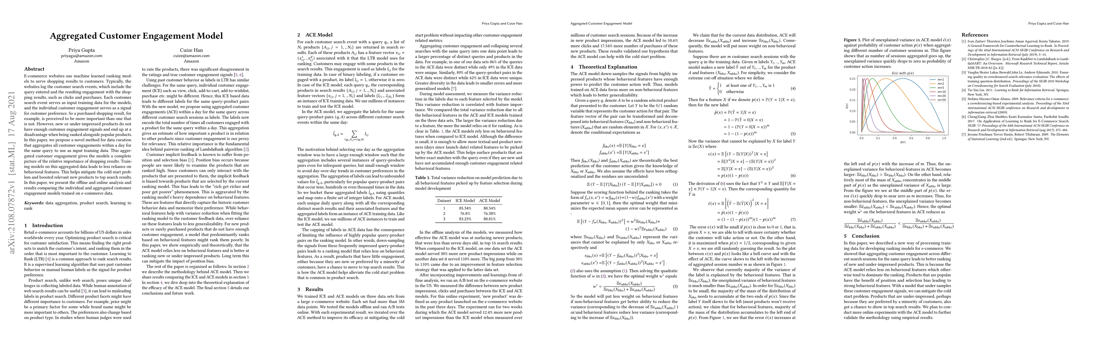 The proposed method aggregates customer engagement across different search sessions for e-commerce ranking models.