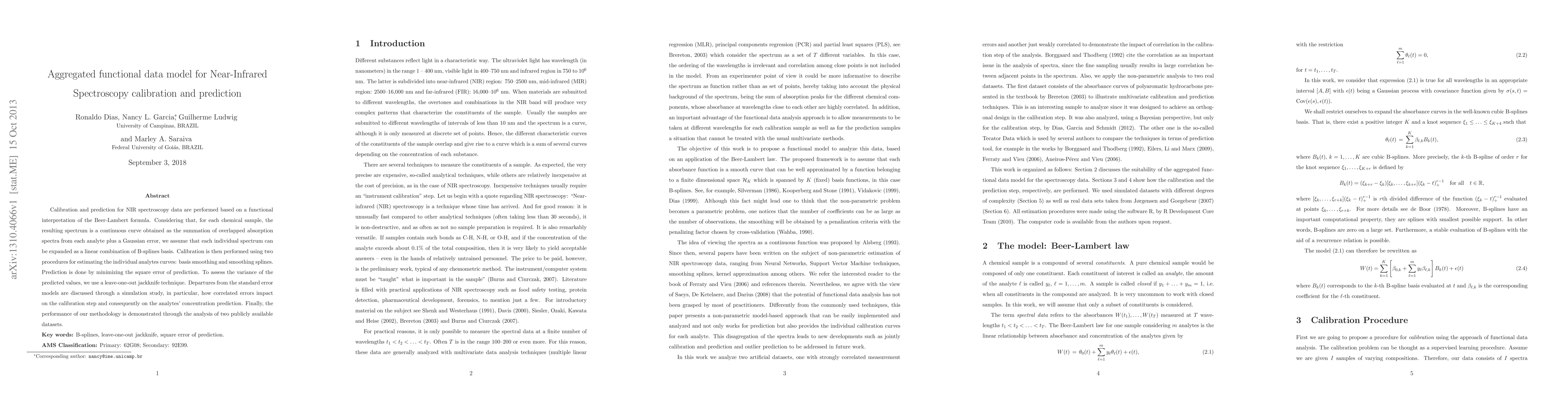 Calibration and prediction for NIR spectroscopy data are performed based on a functional interpretation of the Beer-Lambert formula. Considering that, for each chemical sample, the resulting spectrum is a continuous curve obtained as the summation of overlapped absorption spectra from each analyte plus a Gaussian error, we assume that each individual spectrum can be expanded as a linear combination of B-splines basis. Calibration is then performed using two procedures for estimating the individual analytes curves: basis smoothing and smoothing splines. Prediction is done by minimizing the square error of prediction. To assess the variance of the predicted values, we use a leave-one-out jackknife technique. Departures from the standard error models are discussed through a simulation study, in particular, how correlated errors impact on the calibration step and consequently on the analytes' concentration prediction. Finally, the performance of our methodology is demonstrated through the analysis of two publicly available datasets.
