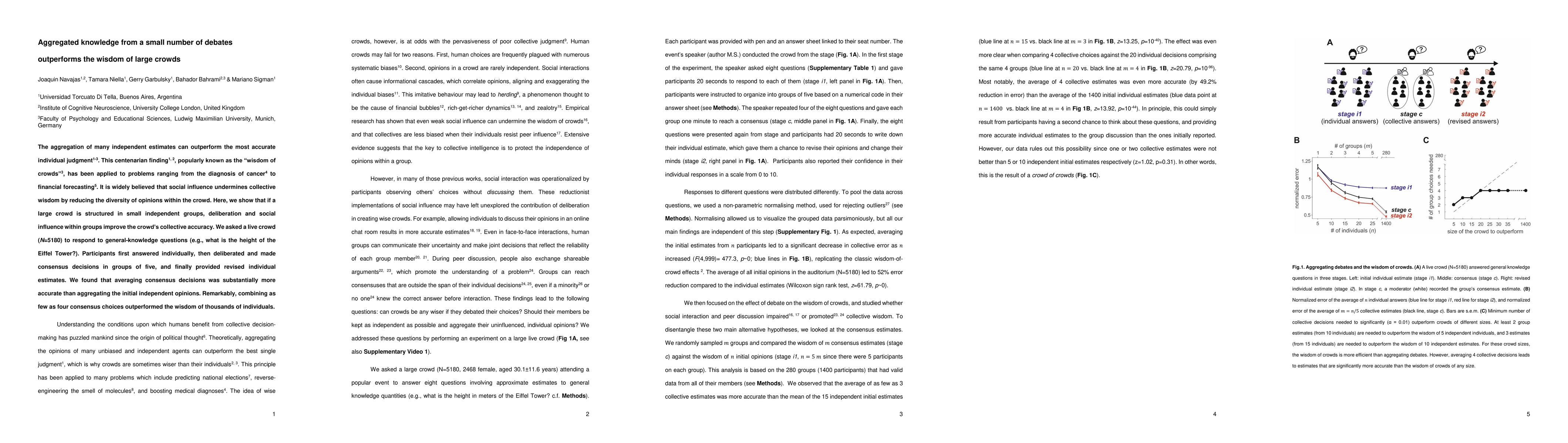 The aggregation of many independent estimates can outperform the most accurate individual judgment. This centenarian finding, popularly known as the wisdom of crowds, has been applied to problems ranging from the diagnosis of cancer to financial forecasting. It is widely believed that social influence undermines collective wisdom by reducing the diversity of opinions within the crowd. Here, we show that if a large crowd is structured in small independent groups, deliberation and social influence within groups improve the crowd's collective accuracy. We asked a live crowd (N=5180) to respond to general-knowledge questions (e.g., what is the height of the Eiffel Tower?). Participants first answered individually, then deliberated and made consensus decisions in groups of five, and finally provided revised individual estimates. We found that averaging consensus decisions was substantially more accurate than aggregating the initial independent opinions. Remarkably, combining as few as four consensus choices outperformed the wisdom of thousands of individuals.