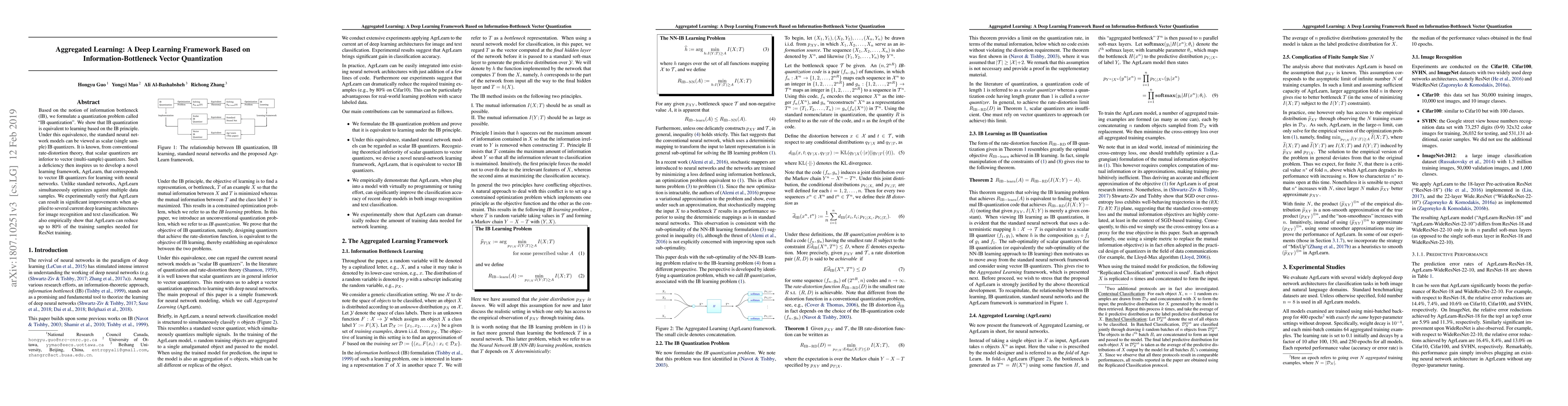 Based on the notion of information bottleneck (IB), we formulate a quantization problem called "IB quantization". We show that IB quantization is equivalent to learning based on the IB principle. Under this equivalence, the standard neural network models can be viewed as scalar (single sample) IB quantizers. It is known, from conventional rate-distortion theory, that scalar quantizers are inferior to vector (multi-sample) quantizers. Such a deficiency then inspires us to develop a novel learning framework, AgrLearn, that corresponds to vector IB quantizers for learning with neural networks. Unlike standard networks, AgrLearn simultaneously optimizes against multiple data samples. We experimentally verify that AgrLearn can result in significant improvements when applied to several current deep learning architectures for image recognition and text classification. We also empirically show that AgrLearn can reduce up to 80% of the training samples needed for ResNet training.