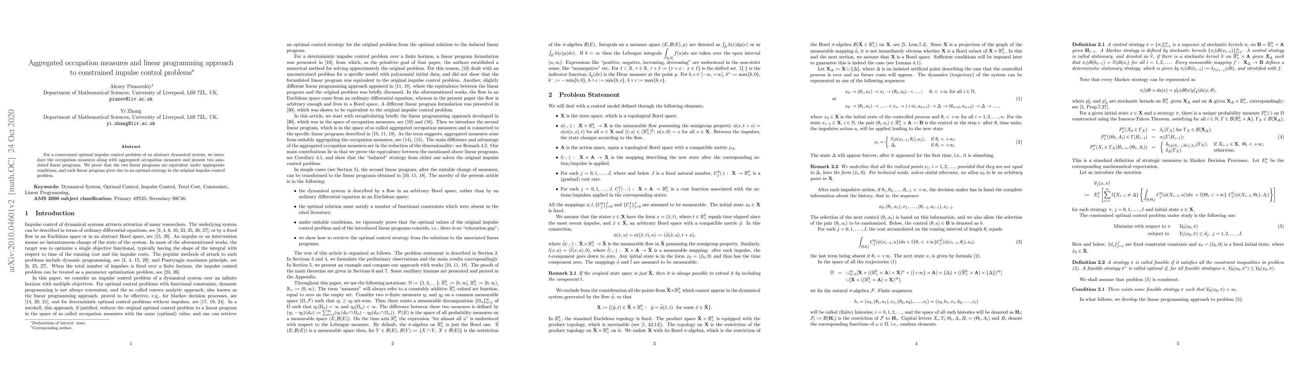 This paper introduces occupation and aggregated occupation measures for solving constrained optimal impulse control problems in abstract dynamical systems. It presents two equivalent linear programs under certain conditions, each providing an optimal strategy for the original problem.