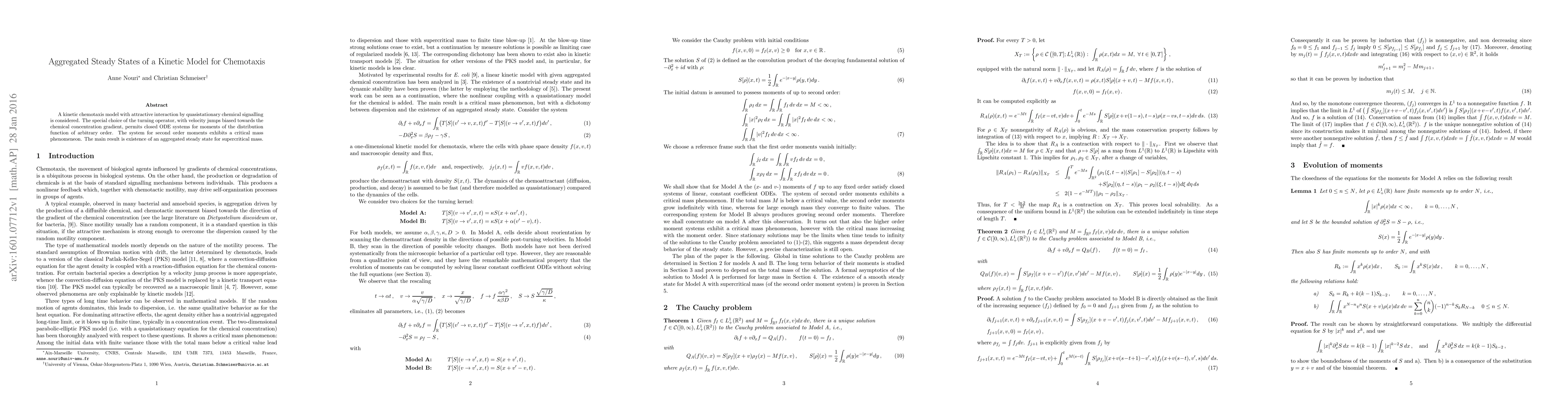 A kinetic chemotaxis model with attractive interaction by quasistationary chemical signalling is considered. The special choice of the turning operator, with velocity jumps biased towards the chemical concentration gradient, permits closed ODE systems for moments of the distribution function of arbitrary order. The system for second order moments exhibits a critical mass phenomeneon. The main result is existence of an aggregated steady state for supercritical mass.