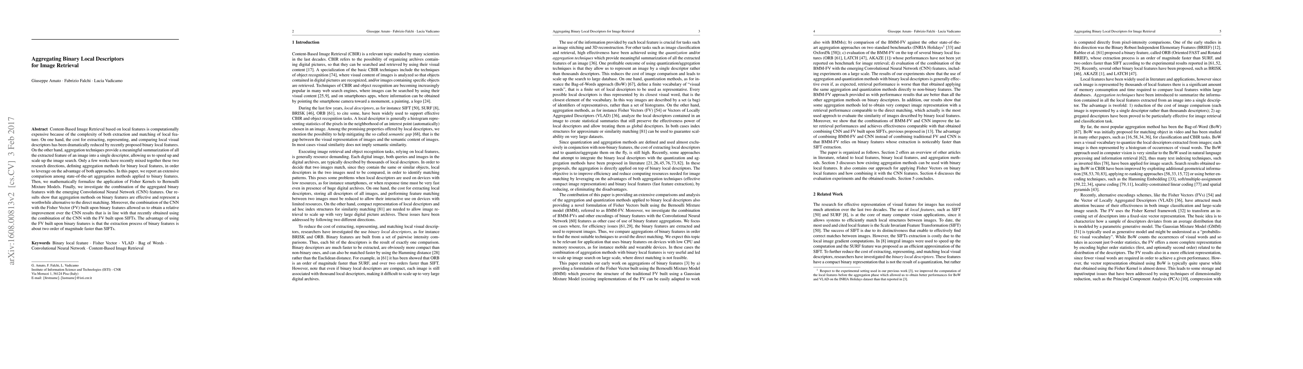 Content-Based Image Retrieval based on local features is computationally expensive because of the complexity of both extraction and matching of local feature. On one hand, the cost for extracting, representing, and comparing local visual descriptors has been dramatically reduced by recently proposed binary local features. On the other hand, aggregation techniques provide a meaningful summarization of all the extracted feature of an image into a single descriptor, allowing us to speed up and scale up the image search. Only a few works have recently mixed together these two research directions, defining aggregation methods for binary local features, in order to leverage on the advantage of both approaches. In this paper, we report an extensive comparison among state-of-the-art aggregation methods applied to binary features. Then, we mathematically formalize the application of Fisher Kernels to Bernoulli Mixture Models. Finally, we investigate the combination of the aggregated binary features with the emerging Convolutional Neural Network (CNN) features. Our results show that aggregation methods on binary features are effective and represent a worthwhile alternative to the direct matching. Moreover, the combination of the CNN with the Fisher Vector (FV) built upon binary features allowed us to obtain a relative improvement over the CNN results that is in line with that recently obtained using the combination of the CNN with the FV built upon SIFTs. The advantage of using the FV built upon binary features is that the extraction process of binary features is about two order of magnitude faster than SIFTs.