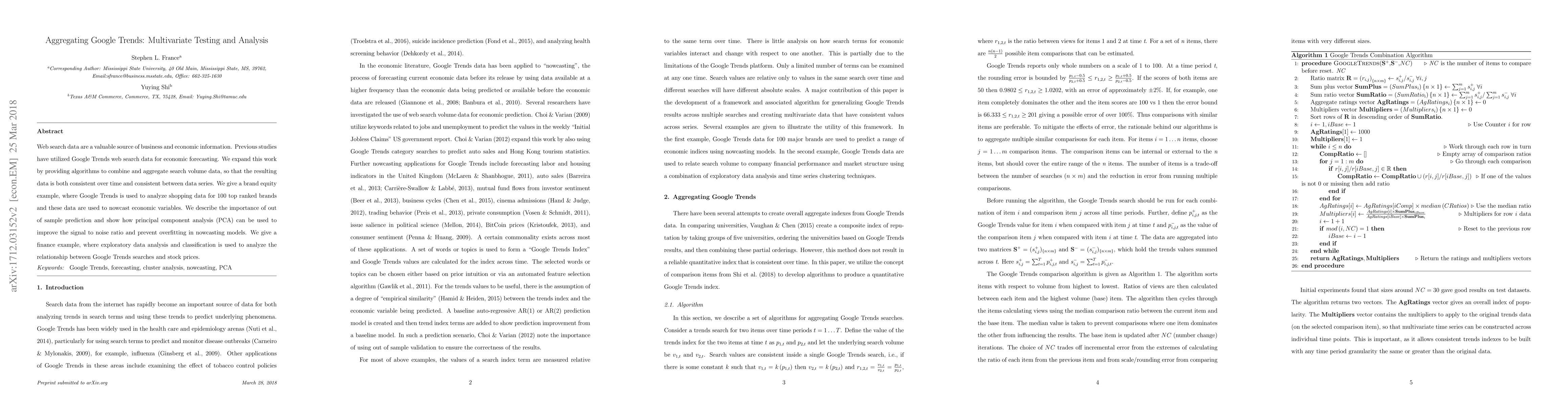 This paper develops algorithms to aggregate Google Trends search data for consistent time-series analysis and applies these methods to analyze shopping data for top brands and stock prices, using PCA to enhance predictive accuracy and prevent overfitting.