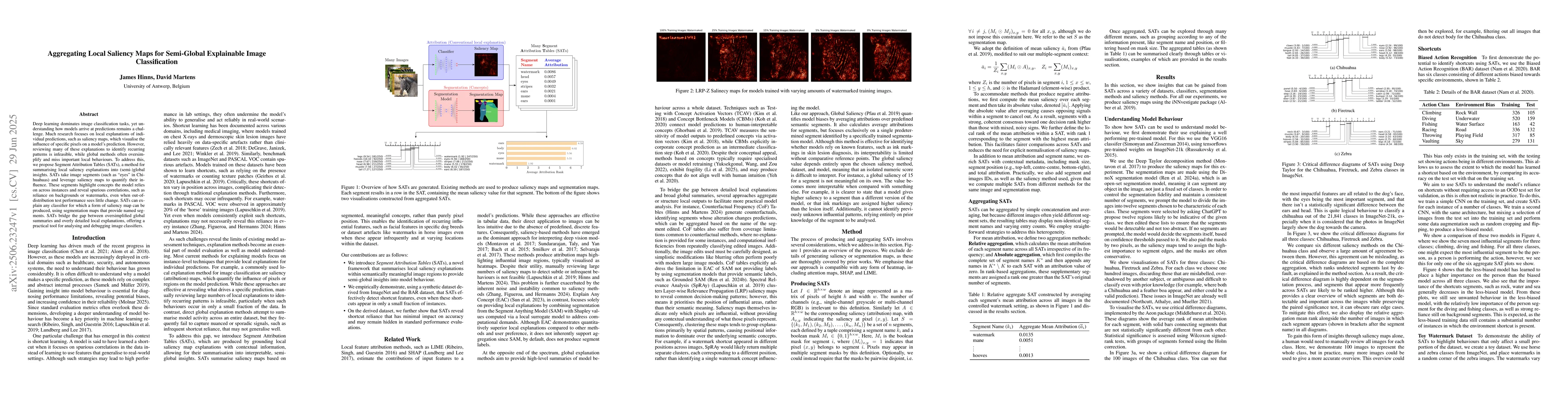 Deep learning dominates image classification tasks, yet understanding how models arrive at predictions remains a challenge. Much research focuses on local explanations of individual predictions, such as saliency maps, which visualise the influence of specific pixels on a model's prediction. However, reviewing many of these explanations to identify recurring patterns is infeasible, while global methods often oversimplify and miss important local behaviours. To address this, we propose Segment Attribution Tables (SATs), a method for summarising local saliency explanations into (semi-)global insights. SATs take image segments (such as "eyes" in Chihuahuas) and leverage saliency maps to quantify their influence. These segments highlight concepts the model relies on across instances and reveal spurious correlations, such as reliance on backgrounds or watermarks, even when out-of-distribution test performance sees little change. SATs can explain any classifier for which a form of saliency map can be produced, using segmentation maps that provide named segments. SATs bridge the gap between oversimplified global summaries and overly detailed local explanations, offering a practical tool for analysing and debugging image classifiers.