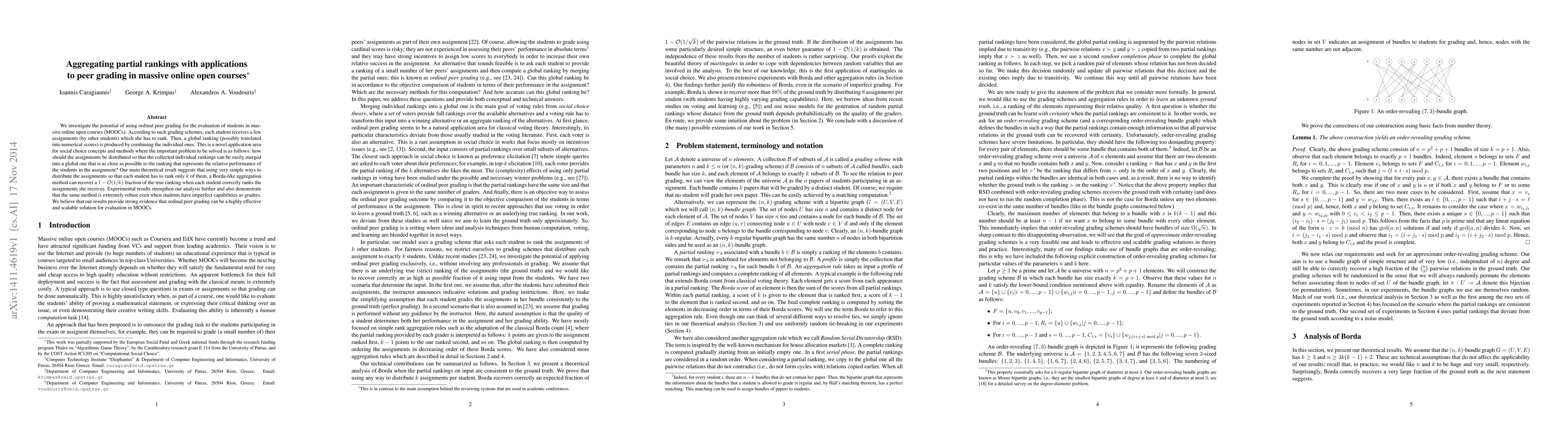 This paper explores the use of ordinal peer grading for evaluating students in massive online open courses (MOOCs) by aggregating partial rankings. The authors propose a method that distributes assignments to students for ranking, and then combines these rankings to form a global ranking, demonstrating that Borda-like aggregation can recover a significant fraction of the true ranking even with imperfect student grading.