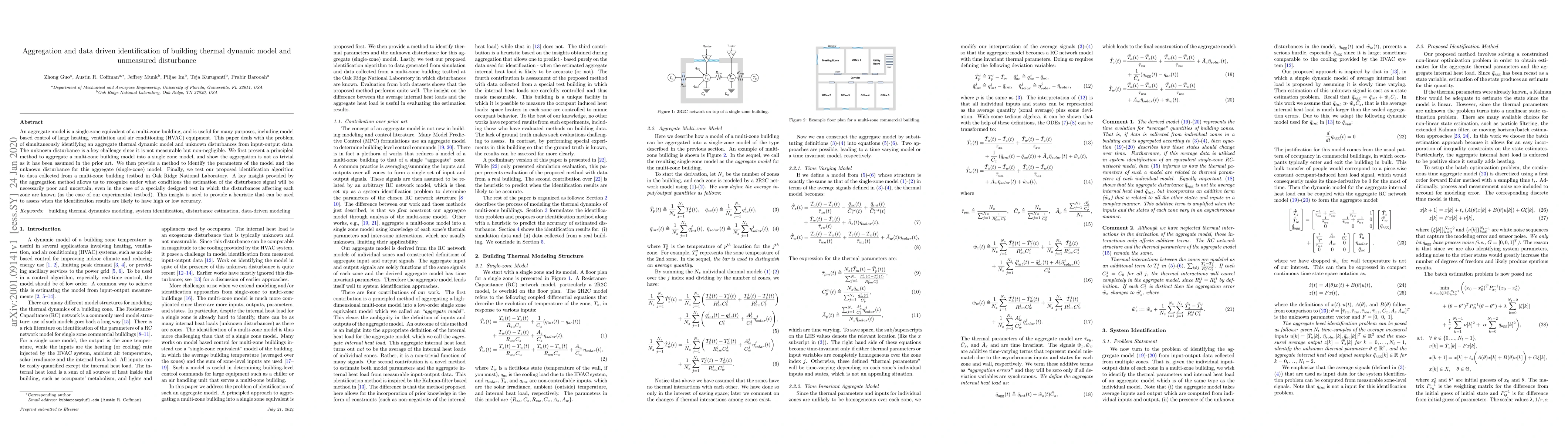 An aggregate model is a single-zone equivalent of a multi-zone building, and is useful for many purposes, including model based control of large heating, ventilation and air conditioning (HVAC) equipment. This paper deals with the problem of simultaneously identifying an aggregate thermal dynamic model and unknown disturbances from input-output data. The unknown disturbance is a key challenge since it is not measurable but non-negligible. We first present a principled method to aggregate a multi-zone building model into a single zone model, and show the aggregation is not as trivial as it has been assumed in the prior art. We then provide a method to identify the parameters of the model and the unknown disturbance for this aggregate (single-zone) model. Finally, we test our proposed identification algorithm to data collected from a multi-zone building testbed in Oak Ridge National Laboratory. A key insight provided by the aggregation method allows us to recognize under what conditions the estimation of the disturbance signal will be necessarily poor and uncertain, even in the case of a specially designed test in which the disturbances affecting each zone are known (as the case of our experimental testbed). This insight is used to provide a heuristic that can be used to assess when the identification results are likely to have high or low accuracy.