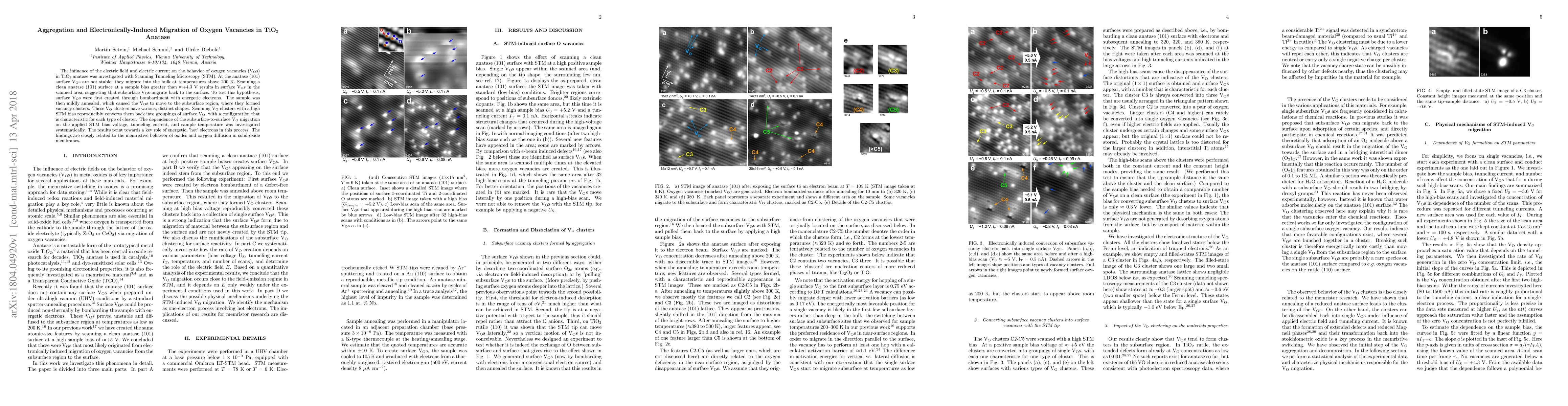 The influence of the electric field and electric current on the behavior of oxygen vacancies (VOs) in TiO2 anatase was investigated with Scanning Tunneling Microscopy (STM). At the anatase (101) surface VOs are not stable; they migrate into the bulk at temperatures above 200 K. Scanning a clean anatase (101) surface at a sample bias greater than +4.3 V results in surface VOs in the scanned area, suggesting that subsurface VOs migrate back to the surface. To test this hypothesis, surface VOs were first created through bombardment with energetic electrons. The sample was then mildly annealed, which caused the VOs to move to the subsurface region, where they formed vacancy clusters. These VO clusters have various, distinct shapes. Scanning VO clusters with a high STM bias reproducibly converts them back into groupings of surface VO, with a configuration that is characteristic for each type of cluster. The dependence of the subsurface-to-surface VO migration on the applied STM bias voltage, tunneling current, and sample temperature was investigated systematically. The results point towards a key role of energetic, 'hot' electrons in this process. The findings are closely related to the memristive behavior of oxides and oxygen diffusion in solid-oxide membranes.