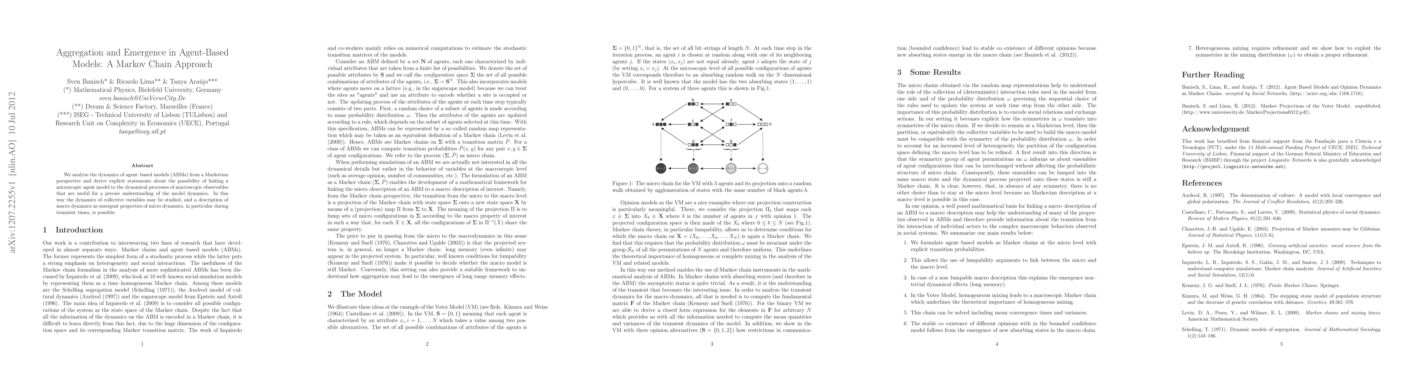 We analyze the dynamics of agent--based models (ABMs) from a Markovian perspective and derive explicit statements about the possibility of linking a microscopic agent model to the dynamical processes of macroscopic observables that are useful for a precise understanding of the model dynamics. In this way the dynamics of collective variables may be studied, and a description of macro dynamics as emergent properties of micro dynamics, in particular during transient times, is possible.