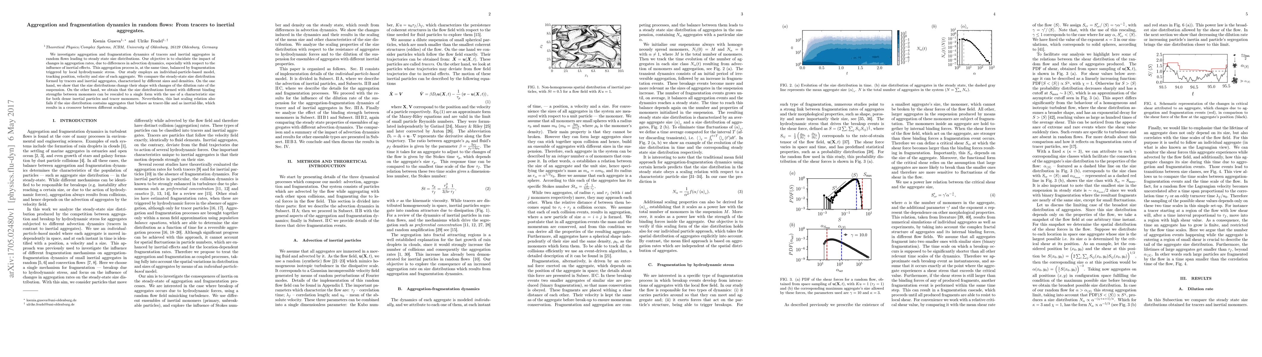 This study explores the dynamics of aggregation and fragmentation in random flows, focusing on tracers and inertial aggregates, and reveals how changes in aggregation rates due to advection dynamics affect size distributions. The research employs an individual-particle-based model and finds that steady-state size distributions can be rescaled based on characteristic sizes, except when aggregates exhibit mixed inertial and tracer-like behavior.